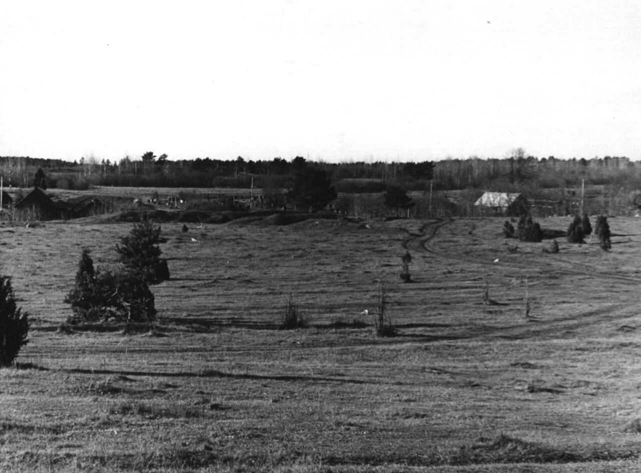 Передний план снимка занимает обширное поле, покрытое невысокой травой и озарённое ярким солнечным светом, что подчёркивается отчётливыми тенями. На среднем плане продолжающееся поле пересекают грунтовые тропы, среди которых встречаются отдельные кустарники и невысокие деревья, а также виден небольшой земляной холм. Задний план композиции завершает густой лес, обрамляющий горизонт, а по краям поля расположены скромные сельские строения, включая здание с двускатной крышей.