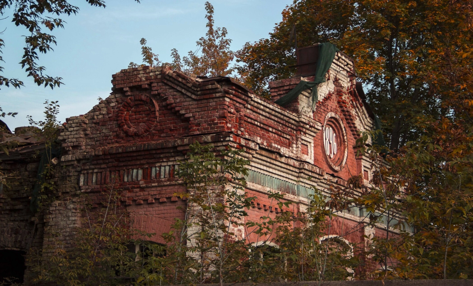 На представленной фотографии запечатлено разрушенное здание Церкви во имя святой блаженной Ксении Петербургской, располагавшейся при заводской больнице Морозовской мануфактуры в городе Орехово-Зуево. Храм являлся частью исторического комплекса промышленных построек, основанных известными предпринимателями Морозовыми в XIX веке.