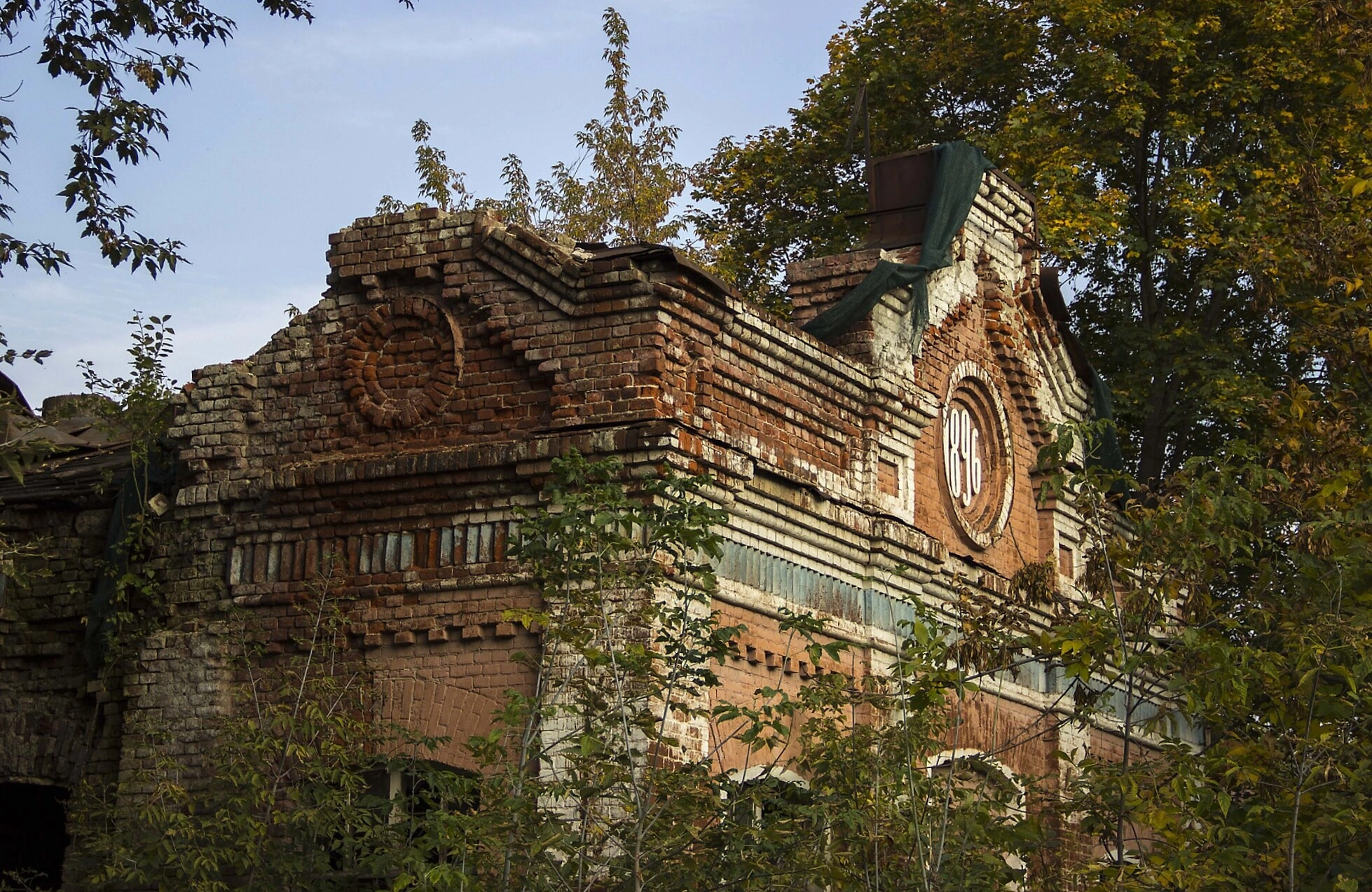 На представленной фотографии запечатлена полуразрушенная церковь во имя святой блаженной Ксении Петербургской, располагавшаяся при заводской больнице в городе Орехово-Зуево. Храмовая постройка, выполненная из красного кирпича, пребывает в состоянии глубокого запустения. Фасад здания сохранил элементы храмовой архитектуры: декоративные кирпичные узоры и круглые ниши, характерные для православного зодчества конца XIX - начала XX века.