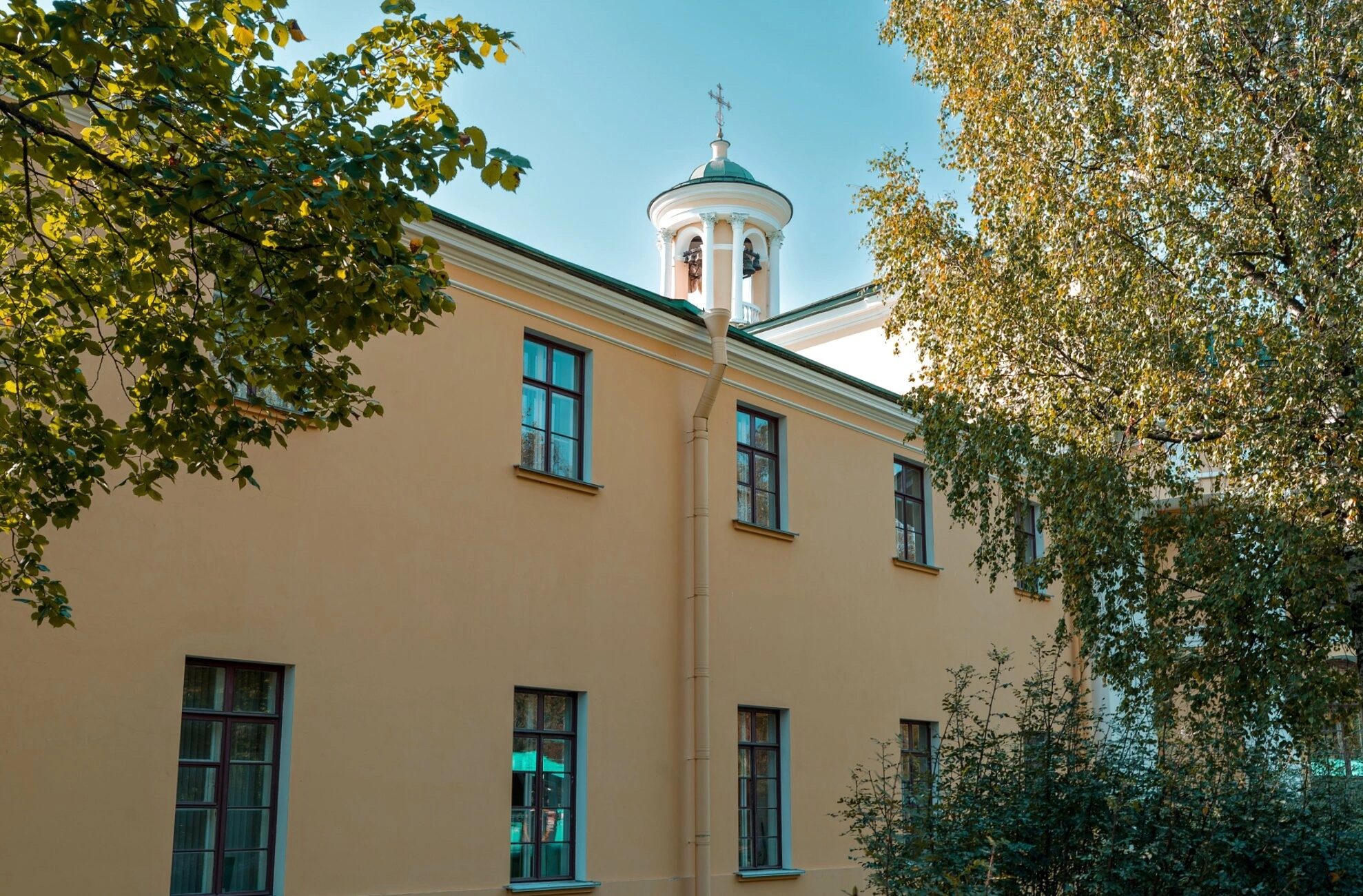 На представленной фотографии запечатлена Церковь святой равноапостольной Марии Магдалины, расположенная в исторической части города Павловска по адресу: Садовая улица, дом 17. Храм находится в непосредственной близости от знаменитого Павловского парка, составляя единый архитектурный ансамбль с другими историческими зданиями города.