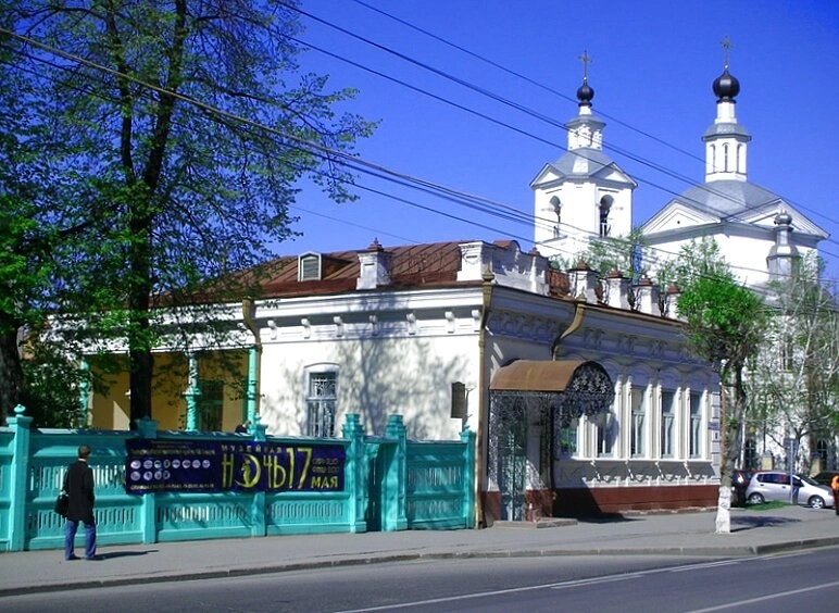На фотографии запечатлен уникальный исторический ансамбль в центре Тюмени, объединяющий два значимых архитектурных памятника — купеческий особняк, известный как Дом Машарова, и старинный православный храм в честь святого Архистратига Михаила.