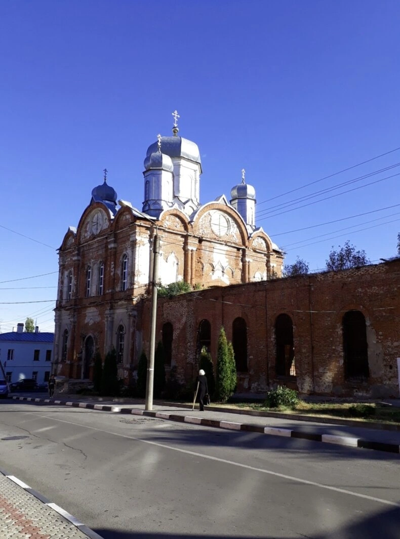 Фасад здания выглядит ветхим: кирпичная кладка местами разрушена, а белые декоративные элементы обветшали. Это состояние — свидетельство сложной истории храма, который был закрыт около 1930 года и долгое время использовался не по назначению. Однако фотография фиксирует и признаки надежды: с 2018 года в храме активно ведутся восстановительные работы. Силами епархии, благотворителей и городских властей уже отремонтирован и действует нижний храм, восстановлены фасады, кровля и колокольня. Таким образом, кадр документально сохраняет важный момент возрождения святыни.