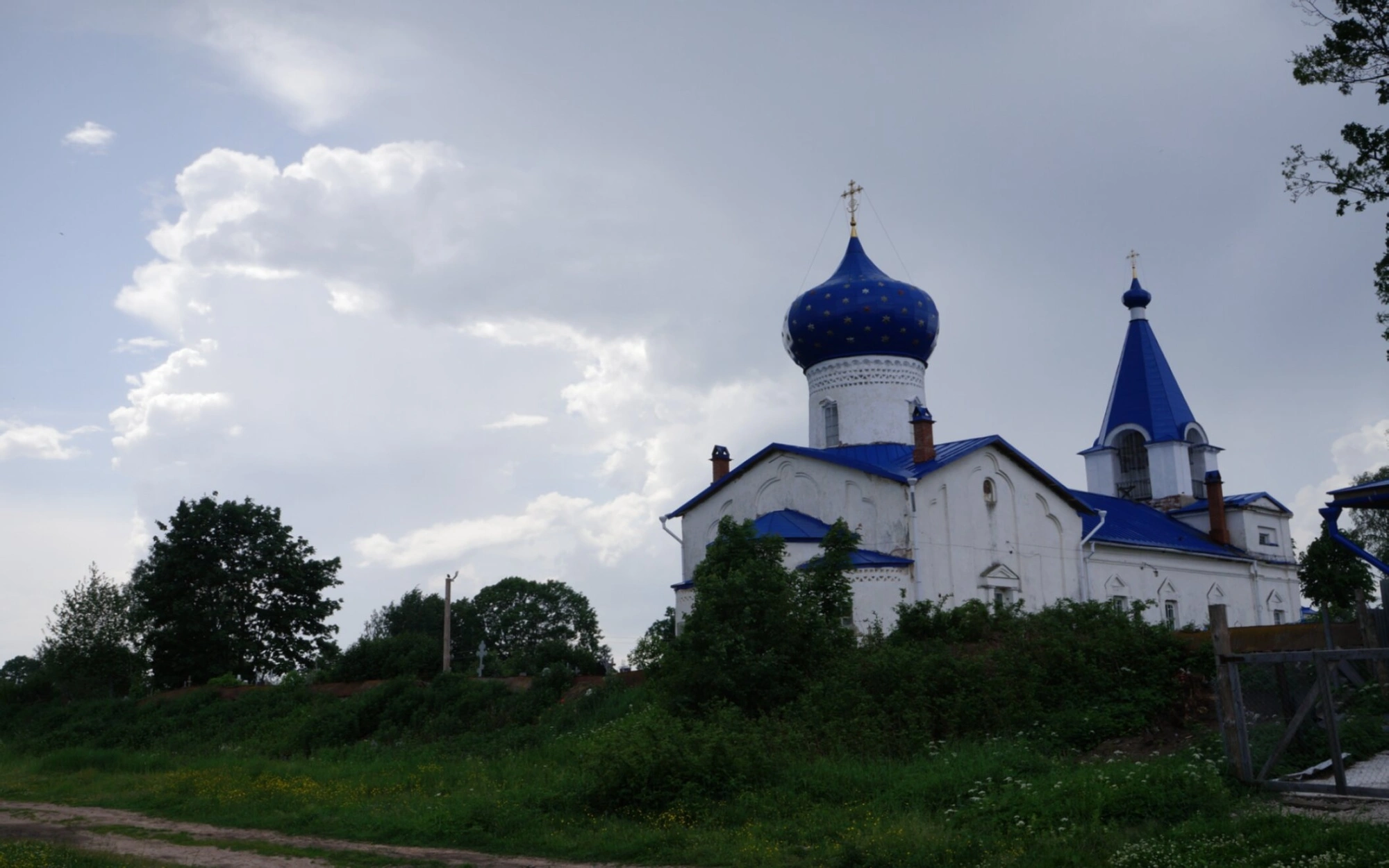 На представленной фотографии запечатлена Церковь Михаила Архангела, расположенная в исторической деревне Кобылье Городище Гдовского района Псковской области. Храм возвышается на живописном холме, окруженный зеленью и вековыми деревьями, что создает особую духовную атмосферу этого намоленного места.