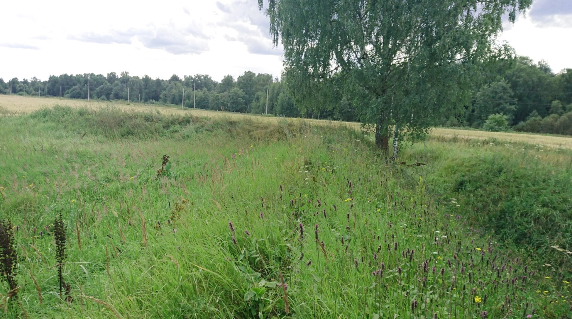 На переднем плане снимка видны заросли луговых трав с фиолетовыми и желтыми цветами, что свидетельствует о разгаре лета. Справа от храма находится стройное дерево, напоминающее березу, которое дополняет композицию кадра. На заднем плане просматривается полоса леса под пасмурным небом, создающая ощущение умиротворения и покоя.