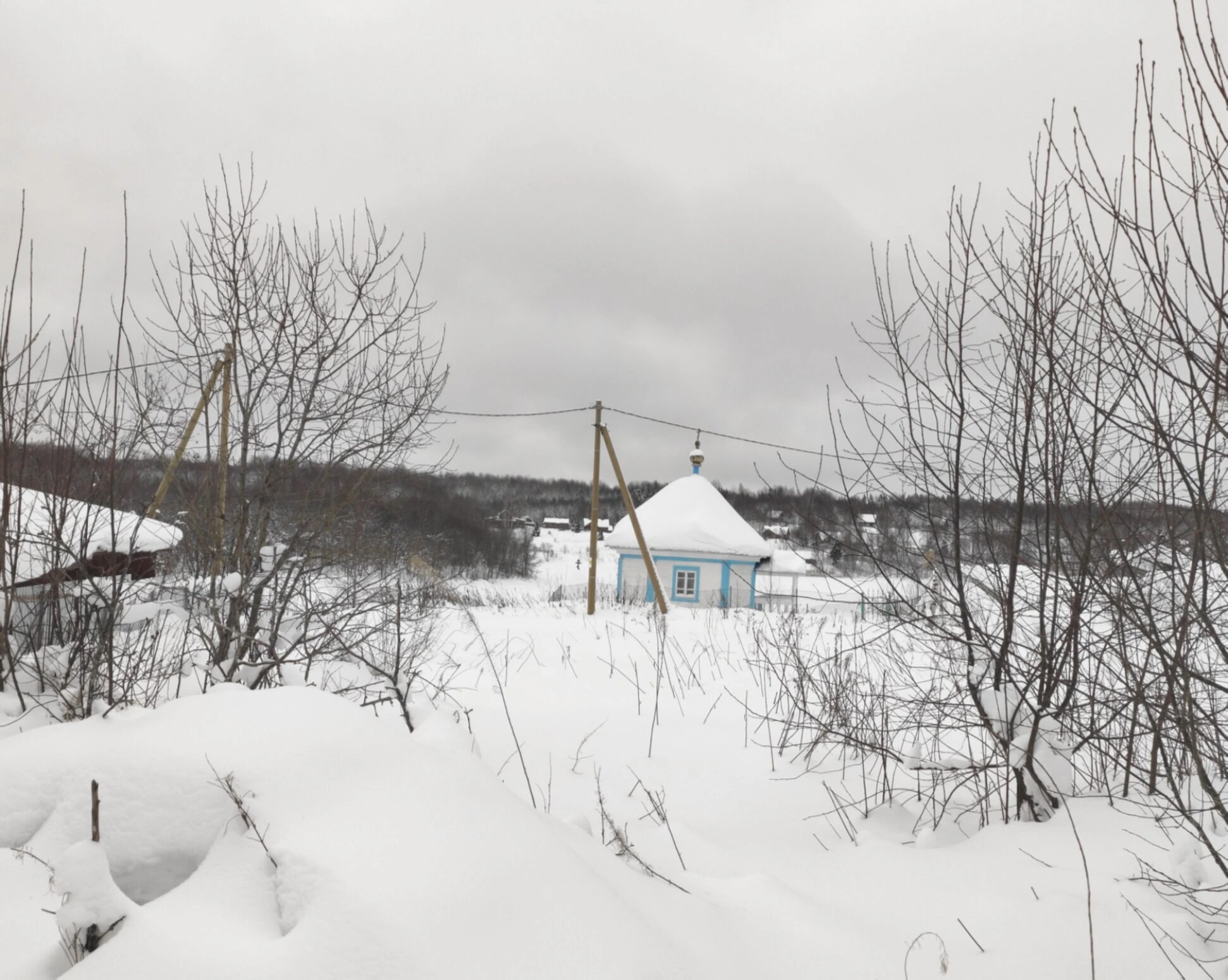 Окружающий пейзаж дополняет атмосферу умиротворения и отрешенности от суетного мира. Голые ветви деревьев и кустарников, лишённые листвы, создают ощущение особого духовного сосредоточения, характерного для зимнего периода в русской глубинке. Пасмурное небо с серыми облаками добавляет фотографии меланхоличного настроения, свойственного северным просторам России.