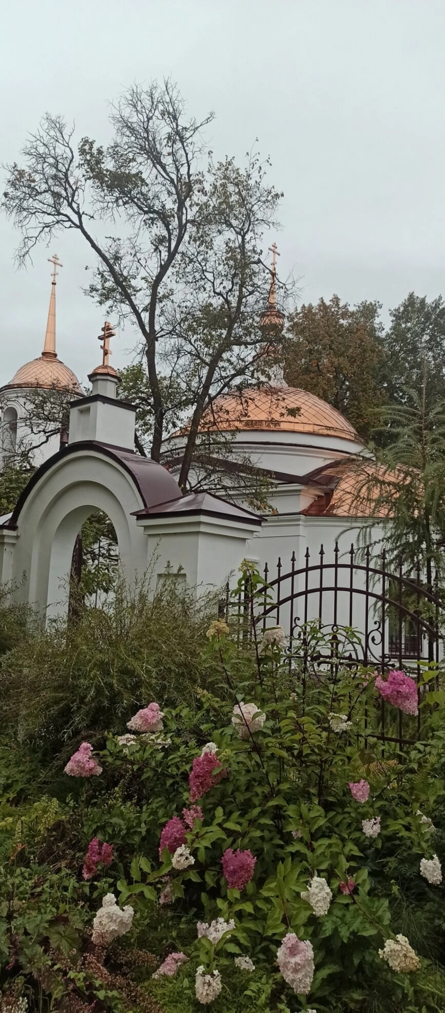 Великолепие церковной архитектуры гармонично дополняется окружающей её живой природой. Купол обрамлён пышной зеленью и соцветиями гортензии метельчатой, создающими ощущение уюта, благоухания и райского сада. Этот живописный контраст между творением рук человеческих и красотой Божьего мира придаёт кадру особую духовную глубину и настроение.
