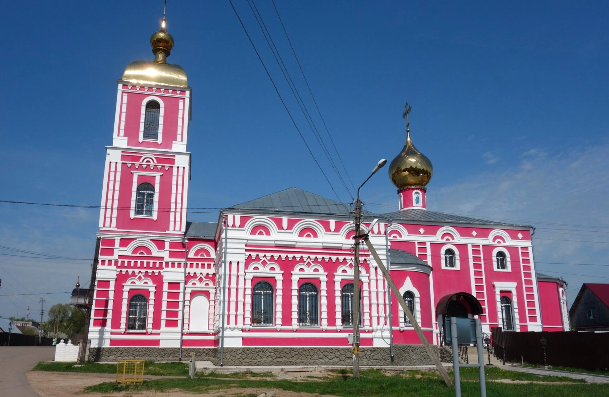 Здание храма окрашено в благородный розовый цвет с белоснежными декоративными элементами, что создает торжественный и нарядный облик. Архитектурный ансамбль включает в себя основную часть храма и высокую колокольню, увенчанную золочеными куполами. Над колокольней возвышается большой золотой купол, в то время как над основной частью храма расположен купол меньшего размера. Оба купола завершаются православными крестами, символизирующими победу жизни над смертью.