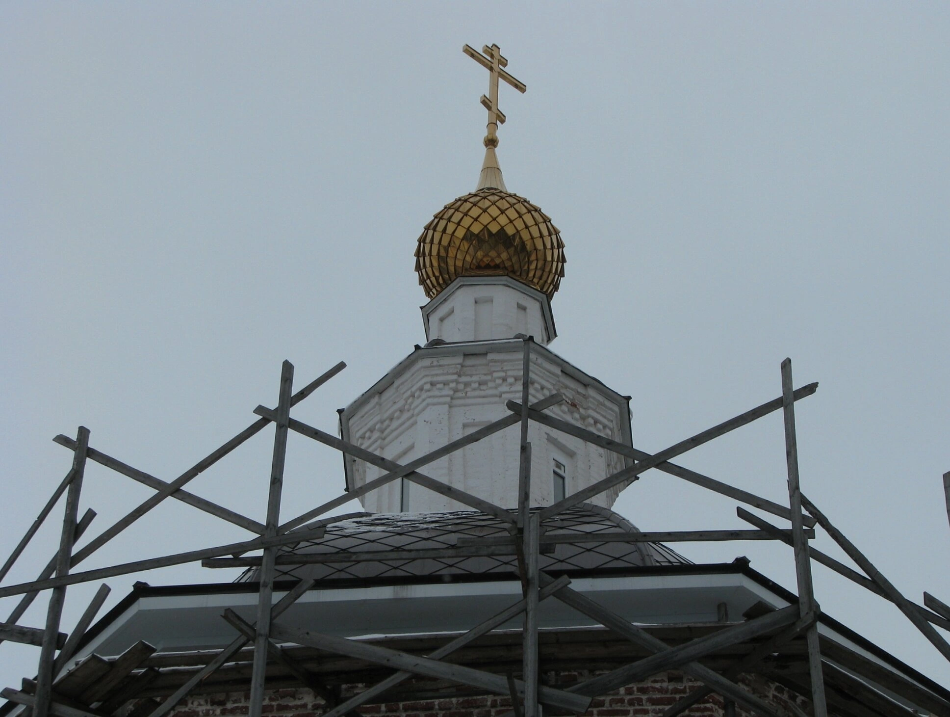 На представленной фотографии запечатлена Церковь Михаила Архангела, расположенная в селе Лучкино Ивановской области. Святыня находится в процессе реставрации, что видно по строительным лесам, окружающим её конструкцию.