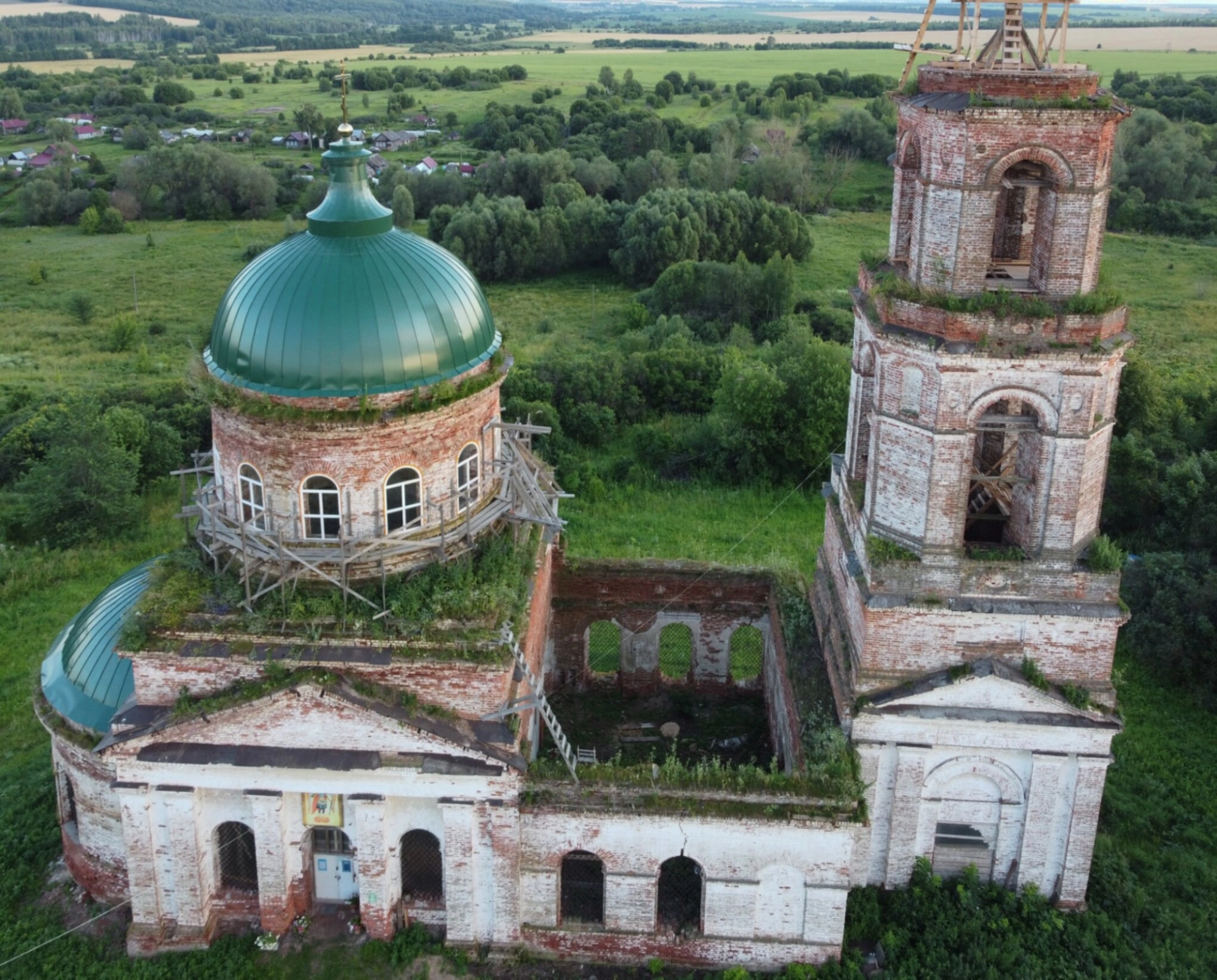Основной объём храма, сложенный из красного кирпича с фрагментами белой штукатурки, венчает свежеустановленный зелёный купол с крестом. Эта деталь, символизирующая победу вечной жизни, контрастирует с общим состоянием постройки. Вокруг купола ещё видны временные деревянные леса, свидетельствующие о недавних или продолжающихся реставрационных работах. Арочные окна с деревянными рамами напоминают о первоначальном благолепии этого дома молитвы.