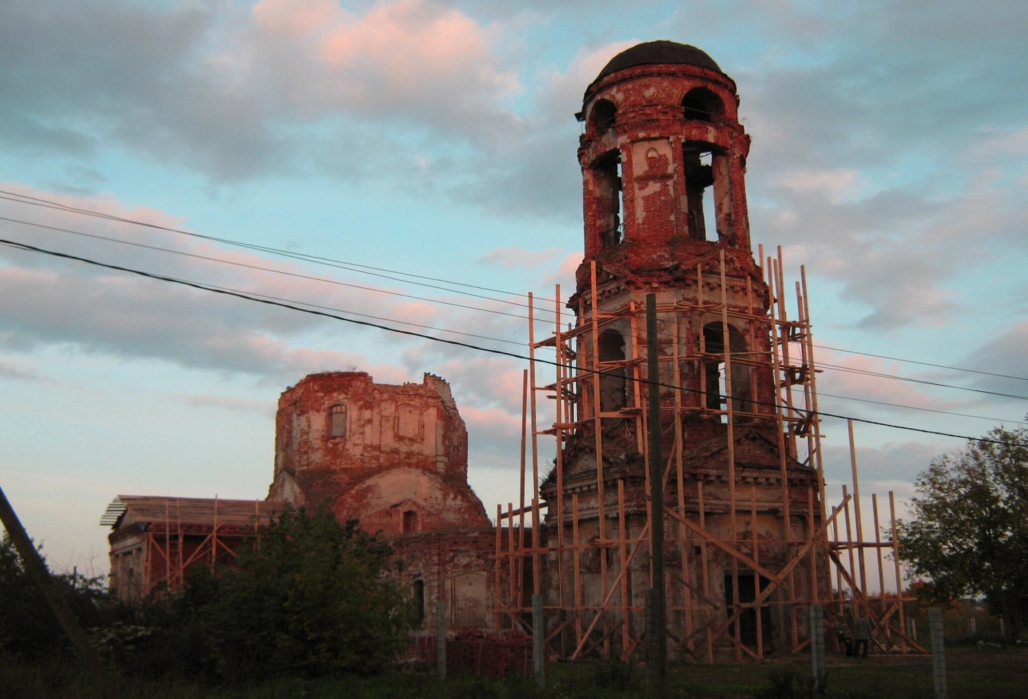 На снимке зафиксирован важный этап в новейшей истории храма — начало реставрационных работ, о чём красноречиво свидетельствуют установленные на ярусе звона колокольни деревянные строительные леса. Несмотря на видимые следы запустения и разрушения, здание сохраняет свои величественные черты и устремлённость ввысь, символизирующую молитвенное предстояние перед Господом.