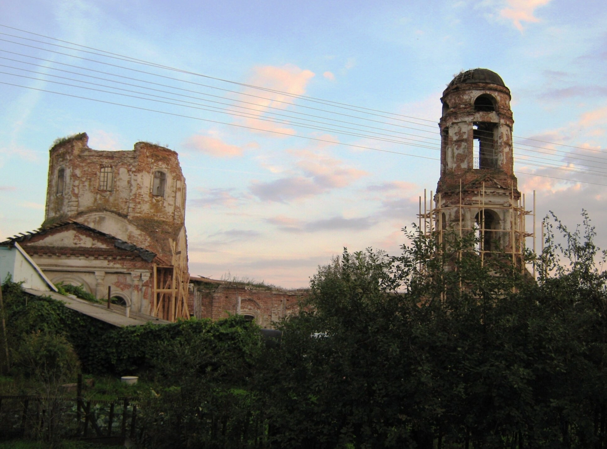 Храм окружен скромным сельским пейзажем: деревья и кустарники обрамляют здание, на переднем плане виднеется небольшое строение, а провода линий электропередачи напоминают о современном контексте существования древней святыни. Пасмурное небо усиливает melanchоличное настроение, возникающее при созерцании этого образа угасающей церковной красоты.