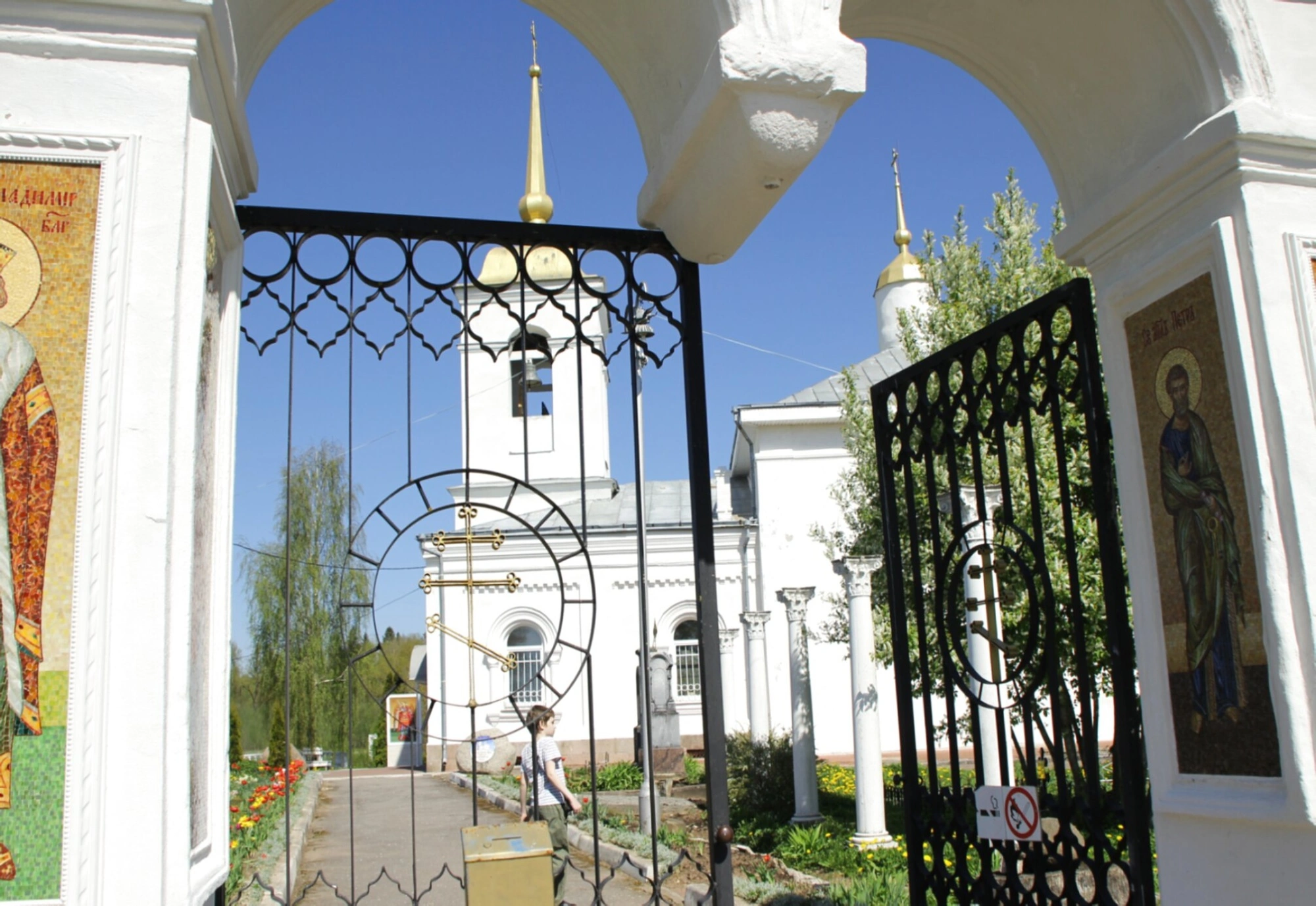 За воротами открывается вид на белоснежное здание церкви, увенчанное золочеными куполами. Колокольня храма гармонично вписывается в общий архитектурный ансамбль. Территория вокруг церкви благоустроена: видны ухоженные цветочные клумбы и декоративные растения, что создает атмосферу благолепия и заботы о святом месте.