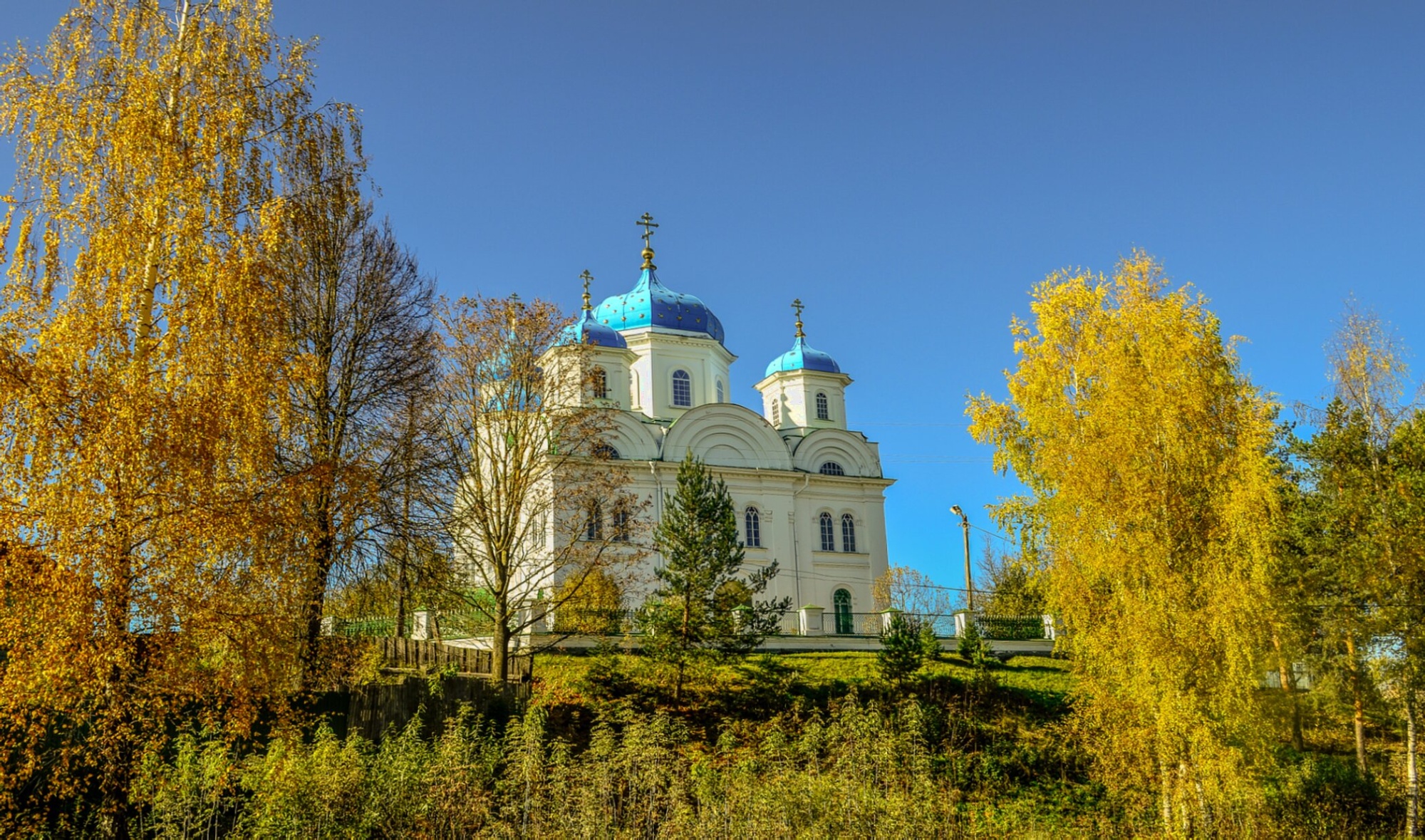 Белоснежные стены церкви гармонично сочетаются с пятью синими куполами, увенчанными золотыми крестами, что символизирует небесную чистоту и божественную благодать. Осенние деревья с золотистой листвой обрамляют святыню, создавая особую атмосферу духовного умиротворения и благоговения.