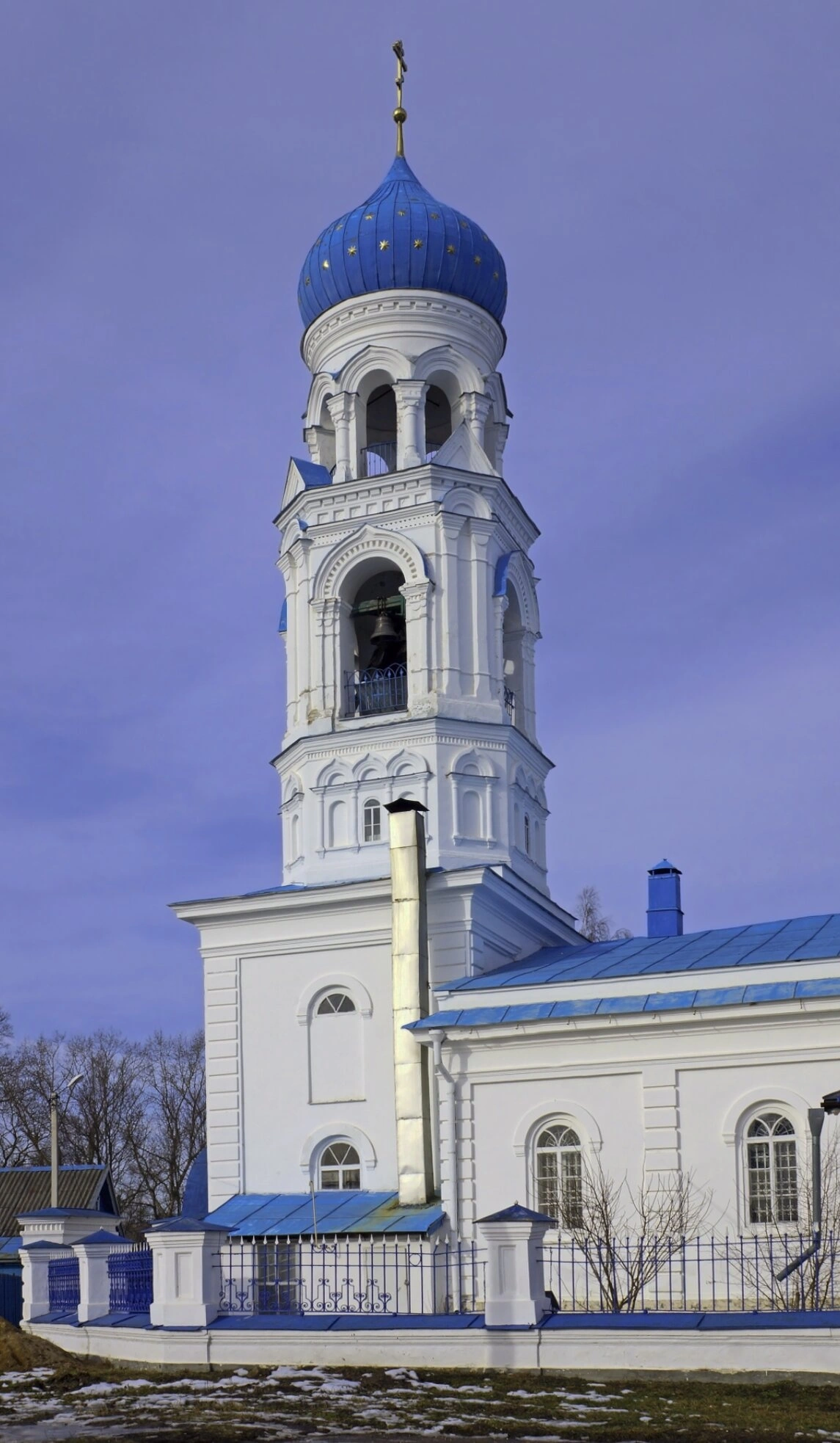 Снимок сделан в межсезонье: земля у подножия храма покрыта остатками снега, а на заднем плане видны голые ветви деревьев и фрагмент ограды. Ясное голубое небо с редкими облаками и мягкий солнечный свет, падающий на храм, создают возвышенное и светлое настроение, подчёркивая благодатную красоту этого святого места. Этот образ наполнен тишиной, спокойствием и намоленностью, свойственной старинным русским храмам.