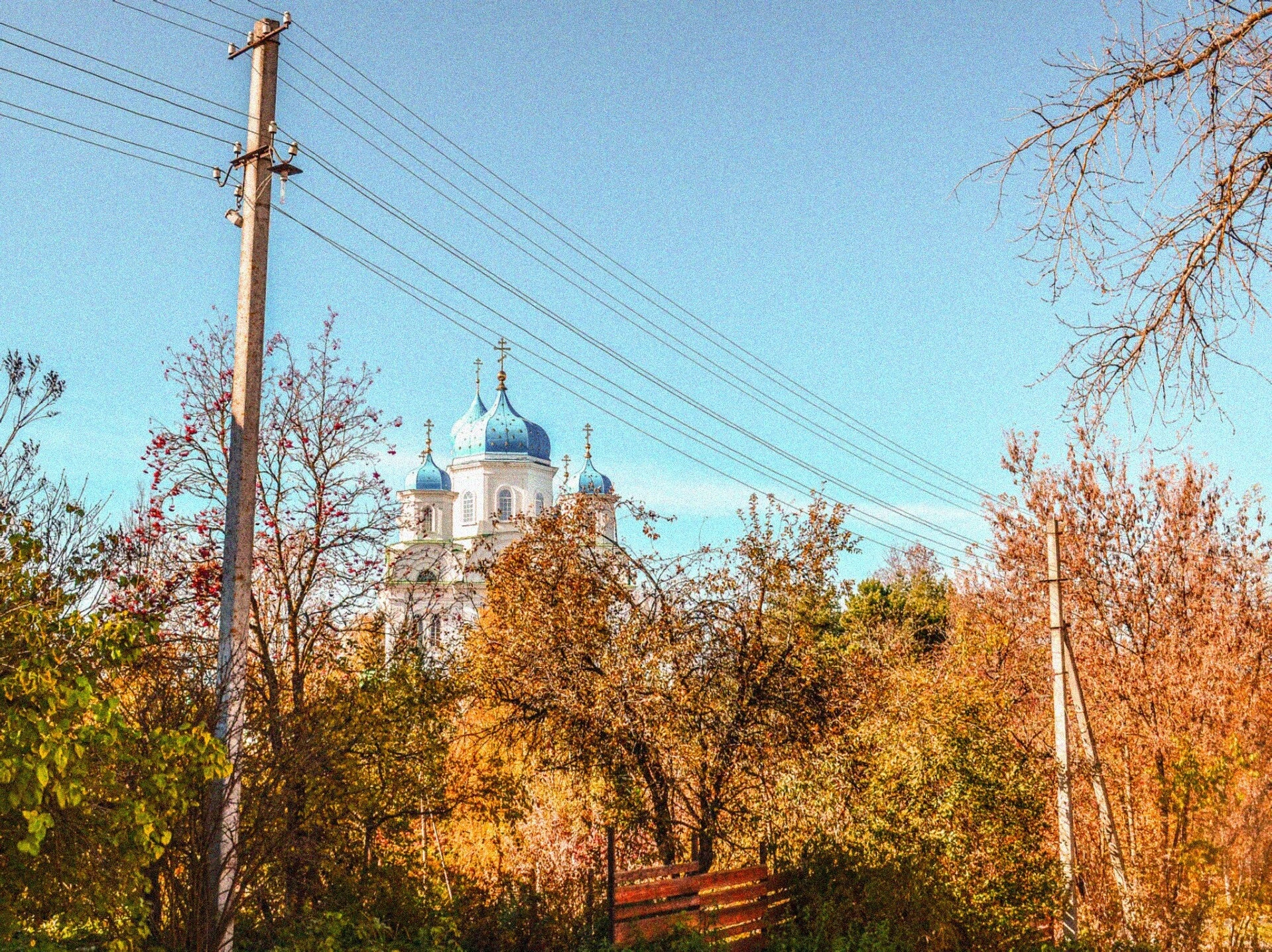 На представленной фотографии запечатлён величественный образ Церкви Михаила Архангела, что располагается в древнем городе Торжке Тверской области. Храм, увенчанный сияющими на осеннем солнце лазурными куполами, частично скрыт за ветвями деревьев, одетых в золотой убор. Электрические провода на переднем плане напоминают о близости современного мира к этому святому месту, создавая уникальный контраст между вечным и временным.