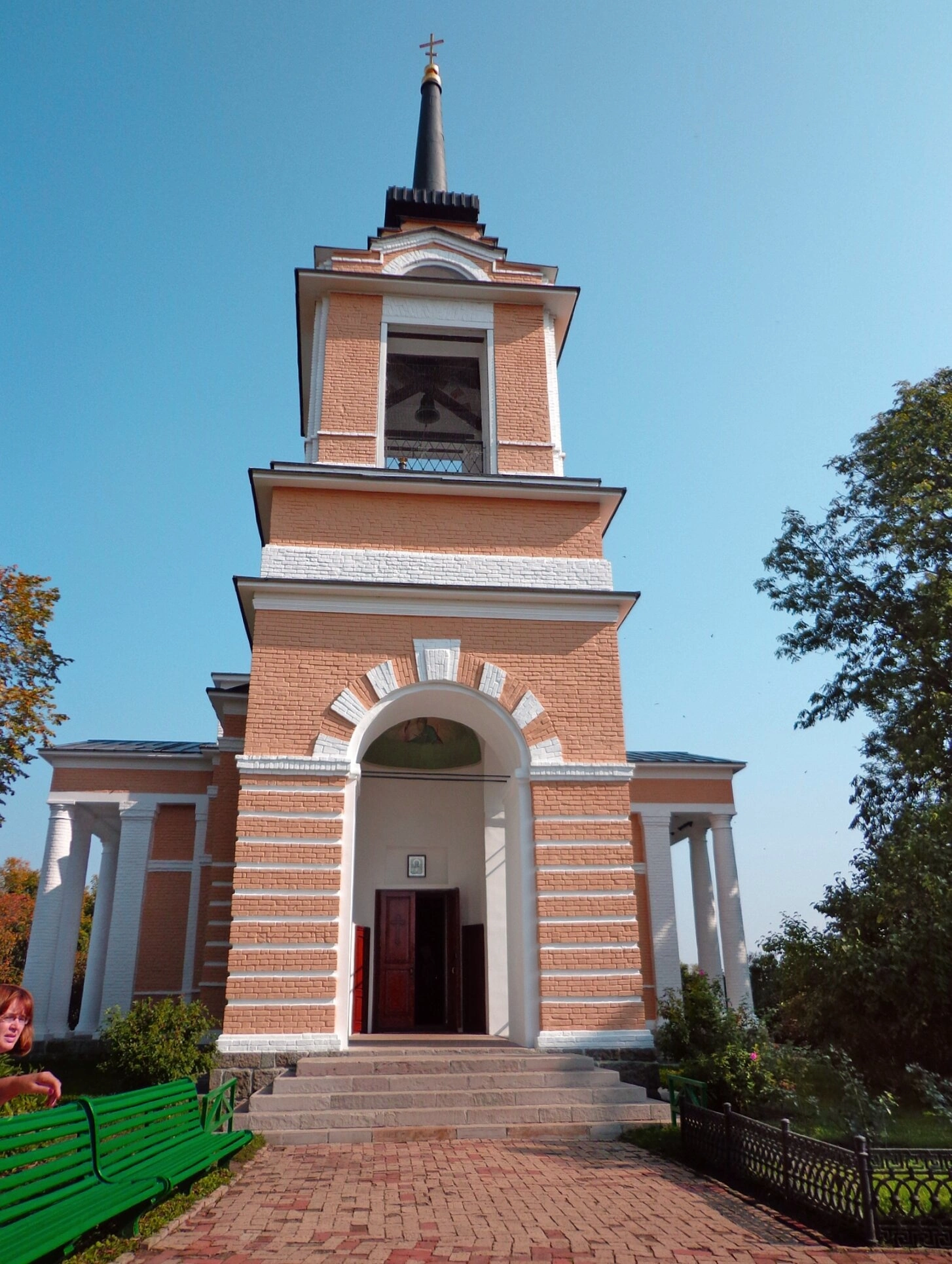 Территория вокруг церкви отличается ухоженностью и благоустроенностью. Аккуратно подстриженные газоны, ухоженные деревья создают атмосферу гармонии и покоя. С правой стороны от здания растет могучее дерево с густой кроной, отбрасывающей тень на кирпичные стены храма. Слева на переднем плане можно заметить зеленую скамейку, на которой сидит человек, что добавляет камерности и жизненности всей композиции.