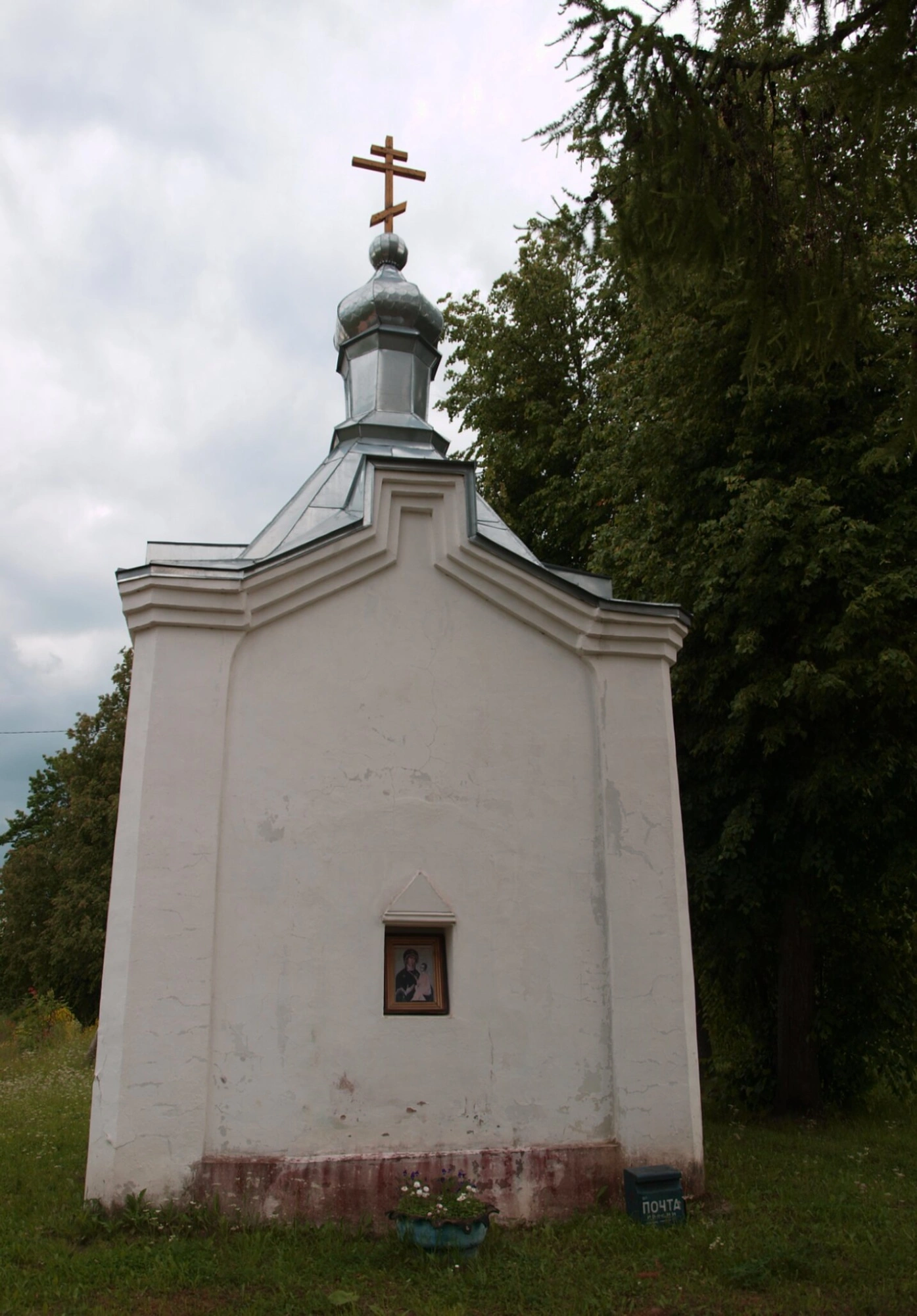 На представленной фотографии запечатлена Церковь Михаила Архангела, расположенная в деревне Зажупанье Сланцевского района Ленинградской области. Это небольшая одноглавая часовня, являющаяся памятником культурного наследия региона.