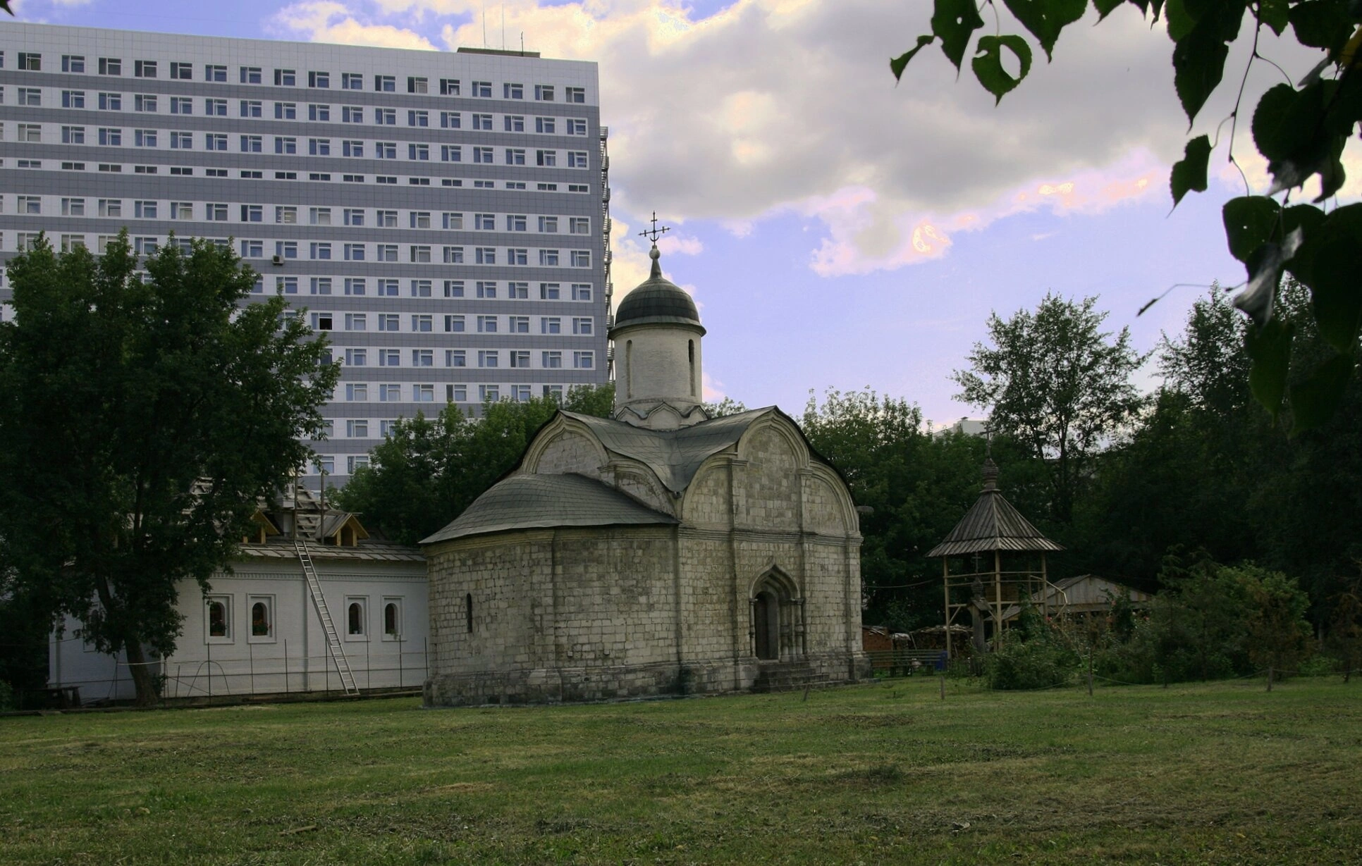 Интересный контраст составляет современное многоэтажное здание, виднеющееся на заднем плане, которое подчеркивает историческую ценность древней святыни, сохранившейся в условиях современного мегаполиса. Небесный свод с облаками завершает композицию снимка, придавая ей особую возвышенность.