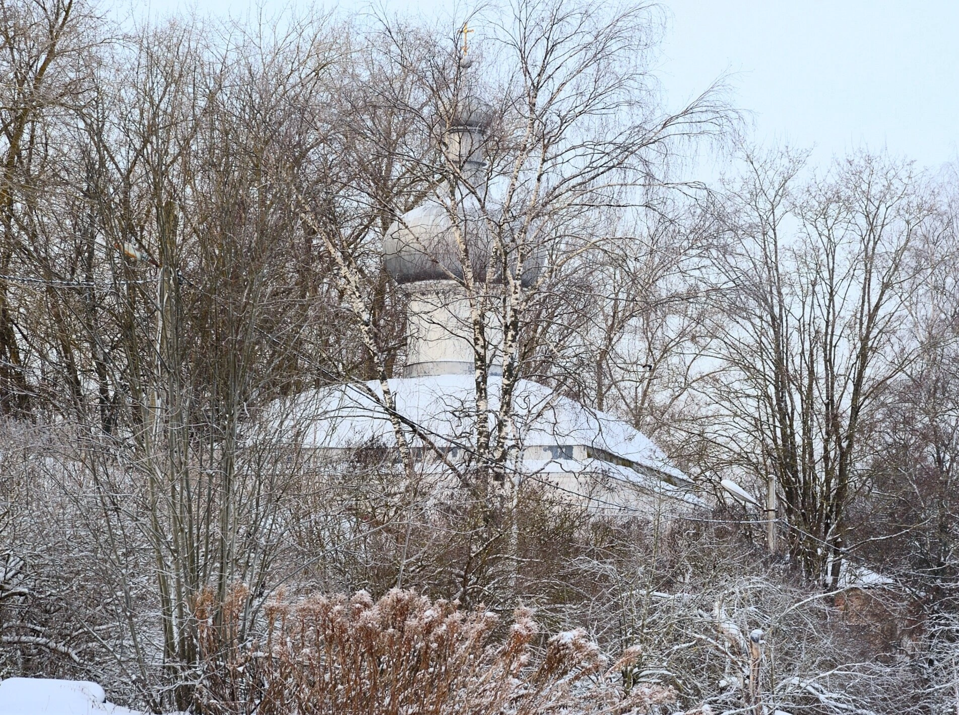 На представленной фотографии запечатлён зимний вид на один из храмов древнейшей православной обители Северо-Запада Руси – Свято-Юрьева монастыря в Великом Новгороде. Среди оголённых ветвей деревьев, укрытых пушистым снегом, возвышается светлый храм, увенчанный золочёной главкой с крестом. Снежный покров мягко лежит на земле, кровлях и ветвях, окутывая всё вокруг благоговейной тишиной, свойственной зимнему времени в святом месте.