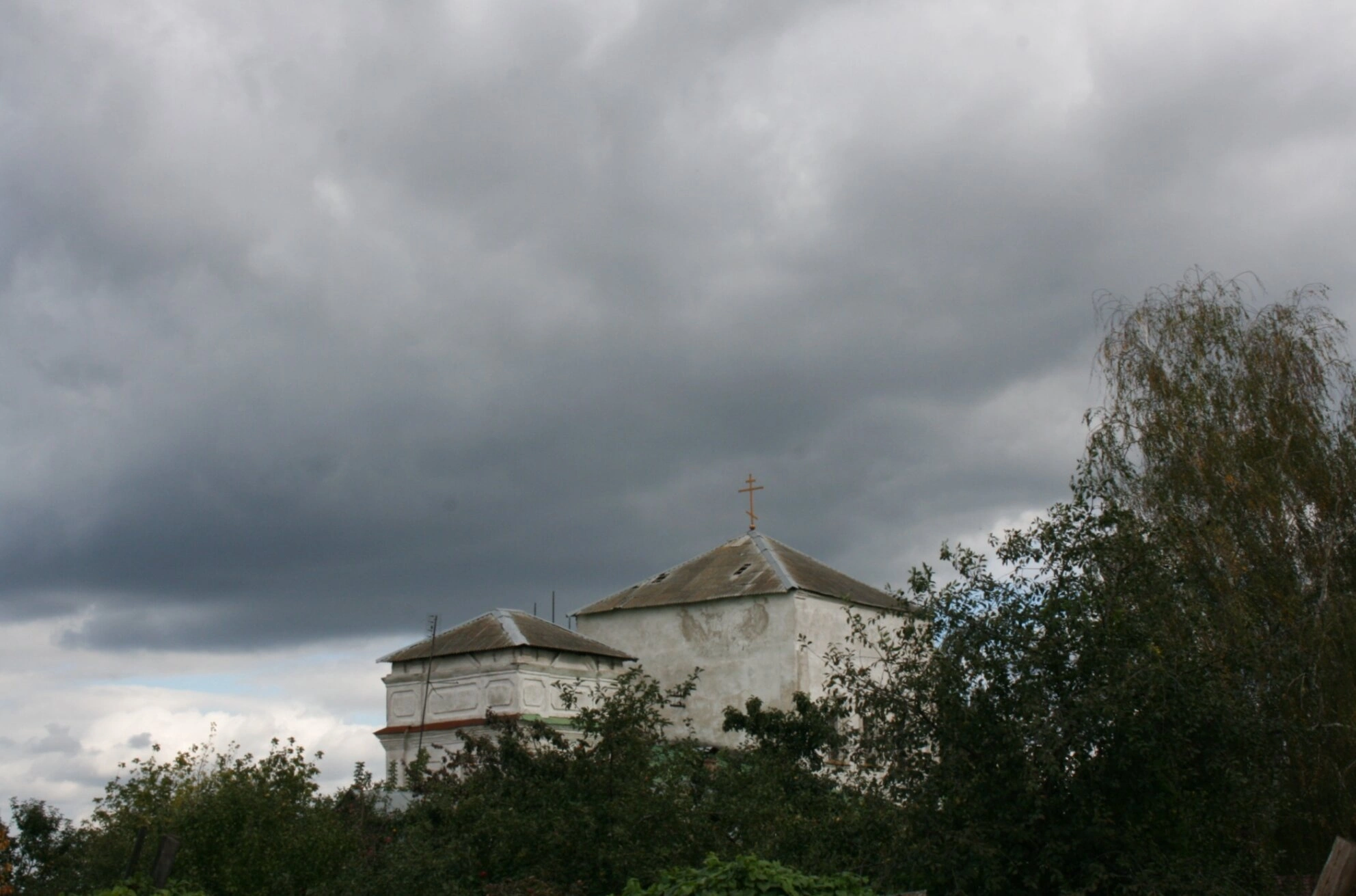 На представленной фотографии запечатлён старинный православный храм — Церковь великомученика Никиты в городе Коломне. Святыня, утопающая в зелени деревьев, предстаёт в момент предгрозового затишья, под сумрачным небом, покрытым тяжёлыми облаками, что придает изображению особую, глубокую и созерцательную атмосферу.