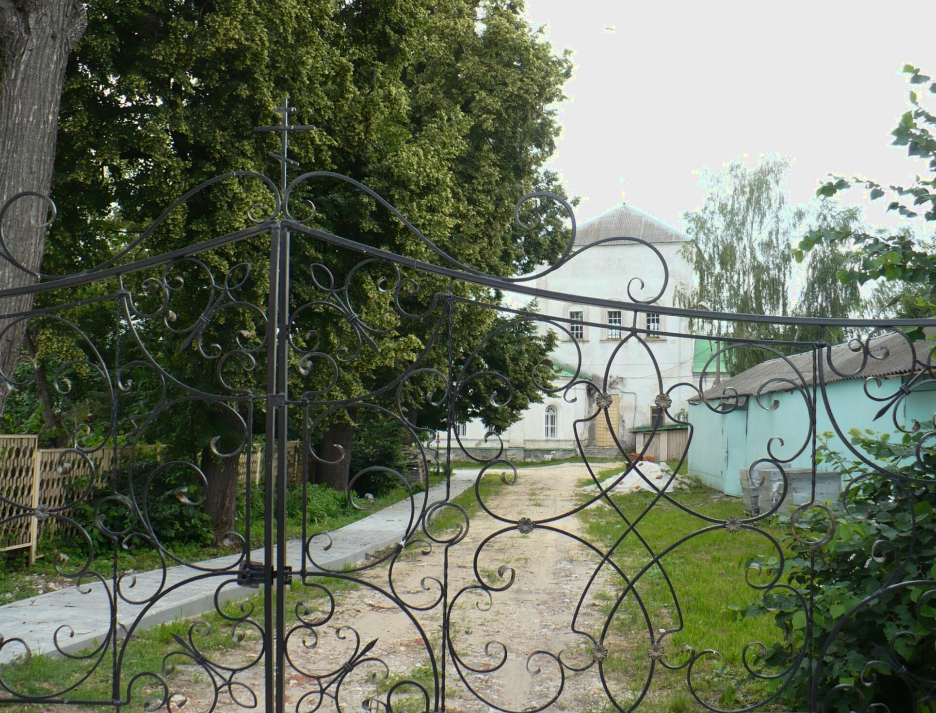 От ворот вглубь территории устремляется грунтовая дорожка, окруженная обильной зеленью деревьев и кустарников. Эта тропа символически ведет верующих от суетного мира к духовному пристанищу - дому Божиему. Пышная растительность создает особую атмосферу уединенности и покоя, способствующую молитвенному настрою.