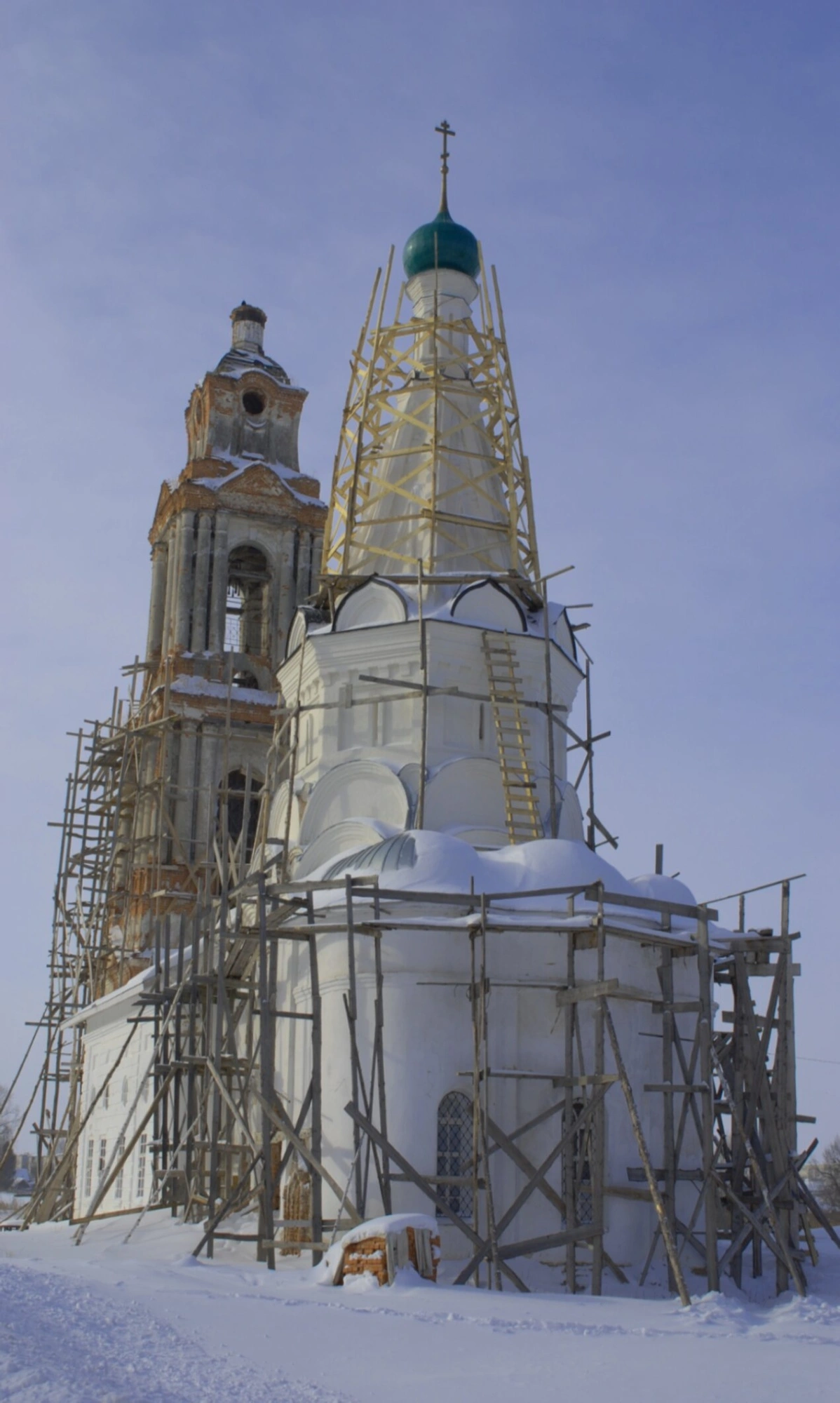 Здание храма находится под попечительством реставраторов, о чём красноречиво свидетельствуют аккуратно установленные строительные леса, охватывающие его основной объём и колокольню. Несмотря на ведущиеся работы, чётко читаются традиционные для русского церковного зодчества формы: восьмерик на четверике и стройная ярусная колокольня, увенчанная шпилем. Особое внимание на себя обращает купол, временно скрытый под защитной конструкцией, что говорит о бережном подходе к восстановлению его исторического облика.