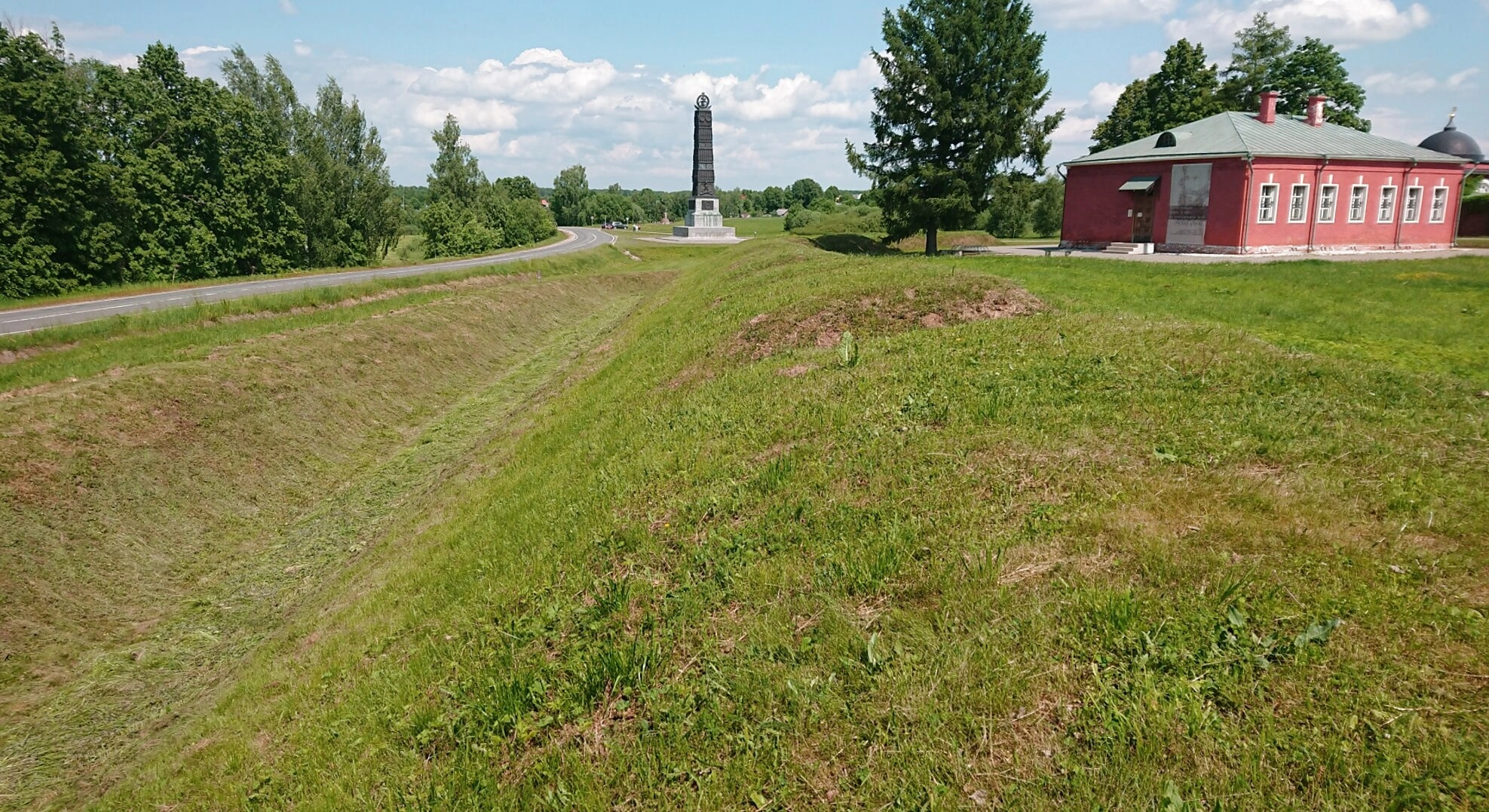 На переднем плане фотографии виден сохранившийся до наших дней ров, за которым простирается пологий склон, поросший травой. В центре композиции возвышается величественный обелиск, установленный в честь защитников Багратионовых флешей. Этот монумент служит вечным напоминанием о подвиге русских солдат.
