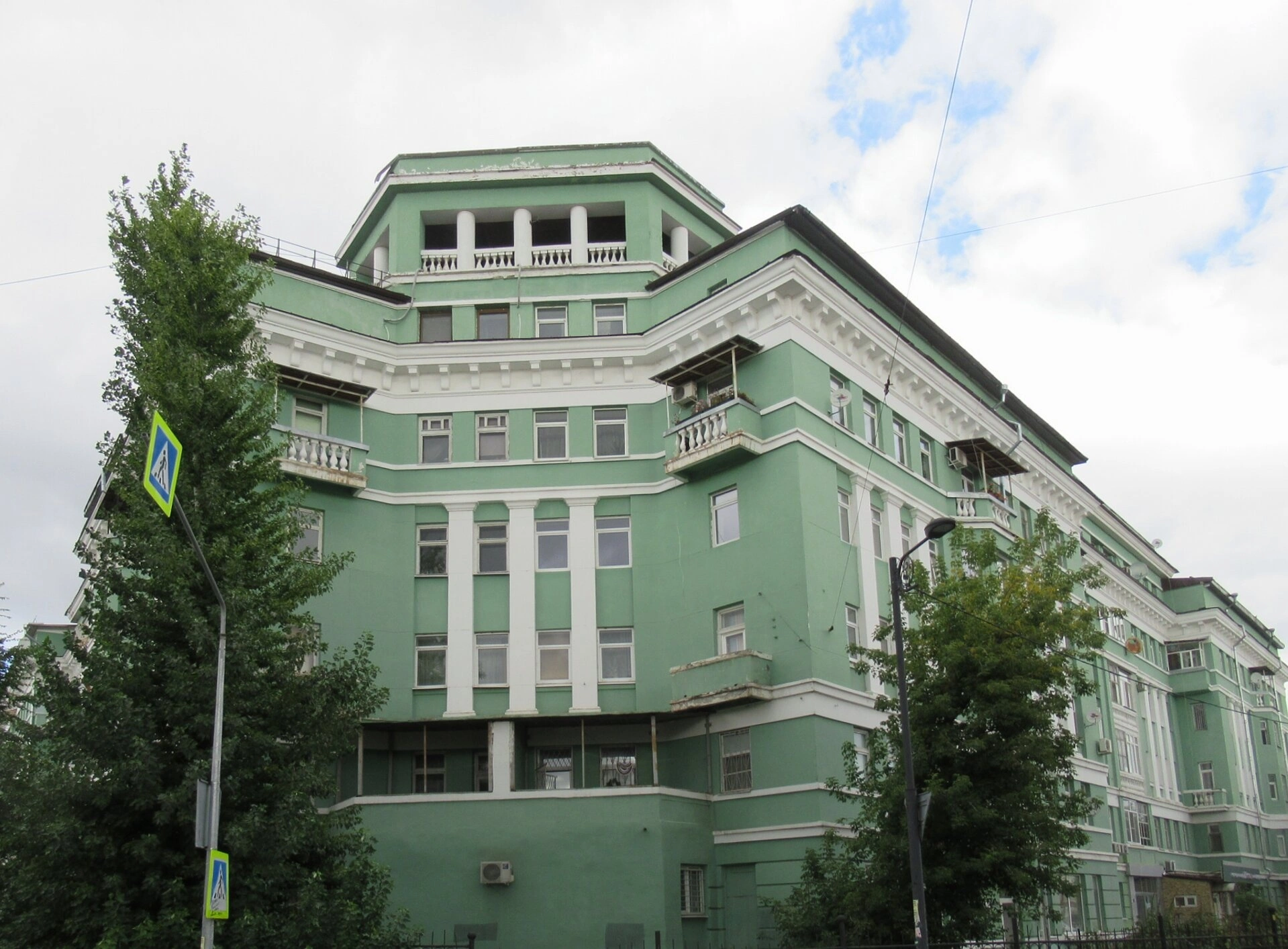 Архитектура фасада включает элементы барокко (главная апсида, четверик, окна) и русского стиля (колокольня, кокошники, завершение четверика). Здание выкрашено в зелёный цвет с белыми декоративными деталями, что подчёркивает его нарядный облик. Вокруг храма видны деревья и дорожные знаки, свидетельствующие о его расположении в жилом районе.