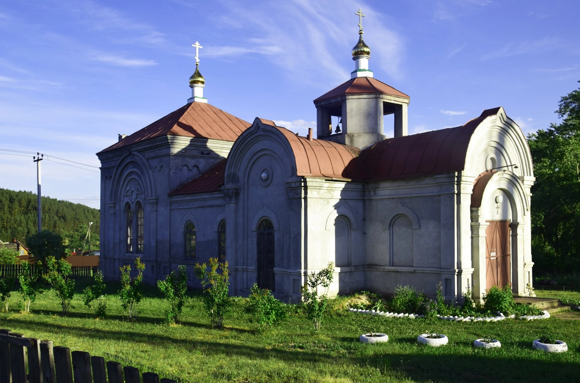 Храм гармонично вписан в окружающий сельский пейзаж. На переднем плане виднеется зелёный травяной покров и невысокий деревянный забор. За церковью простирается линия деревьев, а над ней — спокойное голубое небо с лёгкими облаками. Слева от здания виден столб линии электропередачи, что свидетельствует о современном контексте бытования исторического памятника. На фотографии отсутствуют люди, что позволяет в полной мере сосредоточить внимание на архитектурных деталях и благодатной атмосфере, окружающей этот дом Божий.