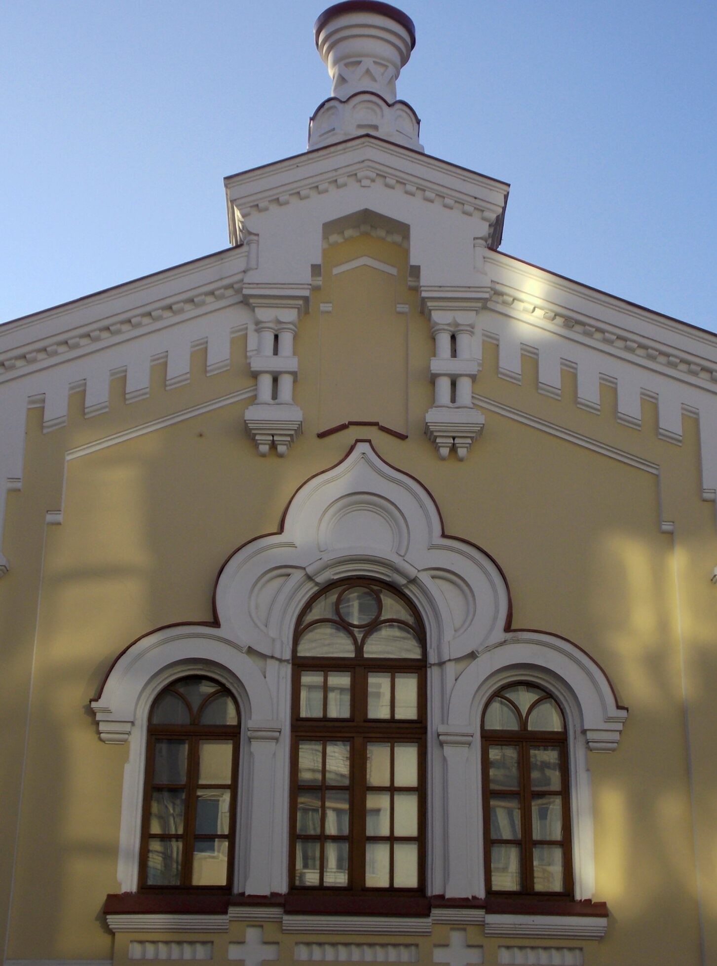Венчает композицию фронтон, украшенный рядом зубчатых элементов и декоративных столбиков, подчеркивающих вертикальную направленность архитектуры, символизирующую устремленность к горнему миру. Цветовое решение фасада выдержано в благообразной гамме: светло-желтые стены гармонично сочетаются с белыми и темно-бордовыми декоративными элементами и оконными рамами.