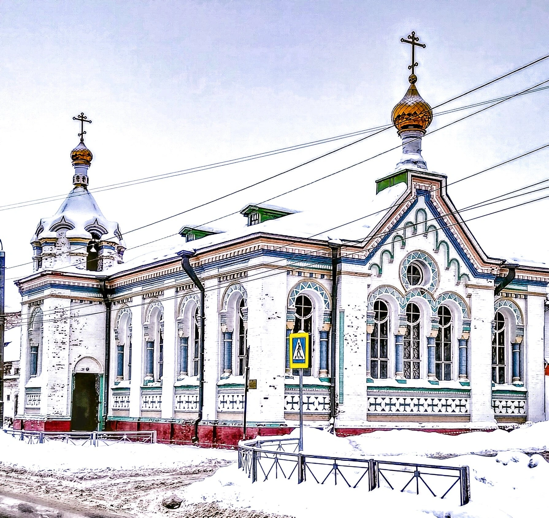 На фотографии запечатлена Церковь Николая Чудотворца, также известная как Никольская церковь, — старинный православный храм в городе Архангельске. Этот архитектурный памятник располагается по адресу: улица Бадигина, дом 10, и является неотъемлемой частью исторического облика и духовной жизни города.