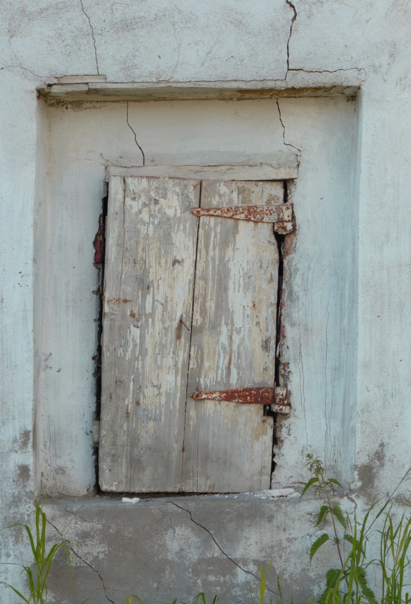 Оштукатуренная стена белого цвета, обрамляющая дверной проем, несет на себе следы времени в виде многочисленных трещин и потертостей. Архитектурное решение включает небольшой выступающий откос, образующий нишевое углубление вокруг входа. В нижней части композиции просматривается бетонный или оштукатуренный цоколь, также демонстрирующий признаки естественного износа.