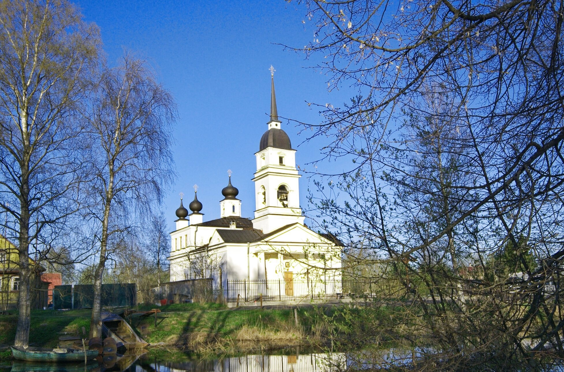 Белоснежный храм с тёмными куполами и высокой колокольней, увенчанной шпилем, является архитектурной доминантой окружающего пространства. Его строгие классические формы и лаконичный силуэт свидетельствуют о простоте и величии православного зодчества. Деревья по берегам реки, некоторые из которых лишены листвы, указывают на раннюю весеннюю или позднюю осеннюю пору, добавляя снимку особое настроение.