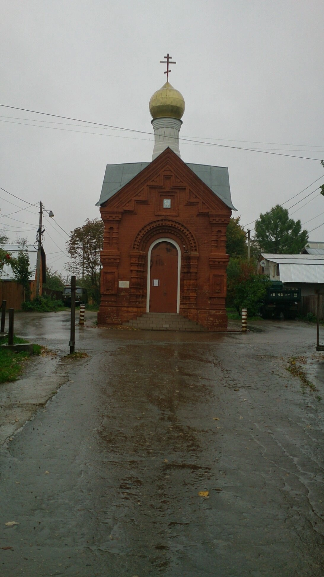 Освещение на фотографии мягкое, рассеянное, характерное для пасмурного дня. Такое естественное освещение подчёркивает скромную красоту православной святыни и создаёт особое молитвенное настроение. Исторически подобные часовни возводились в местах, особо почитаемых верующими, и служили для совершения молитв и кратких богослужений.
