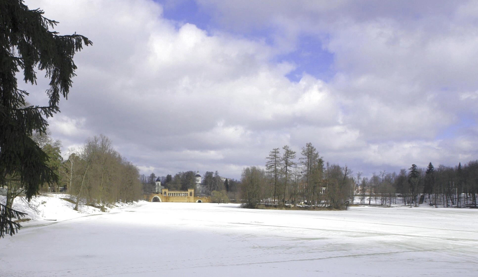 Перед храмом простирается замерзший водоем, покрытый pristine снежным покровом, который отражает небесную чистоту и духовное спокойствие. Архитектурную композицию дополняет кирпичная арочная постройка, harmoniously вписанная в ансамбль церковной территории. Эта постройка служит органичным переходным элементом между природным ландшафтом и священным пространством храма.