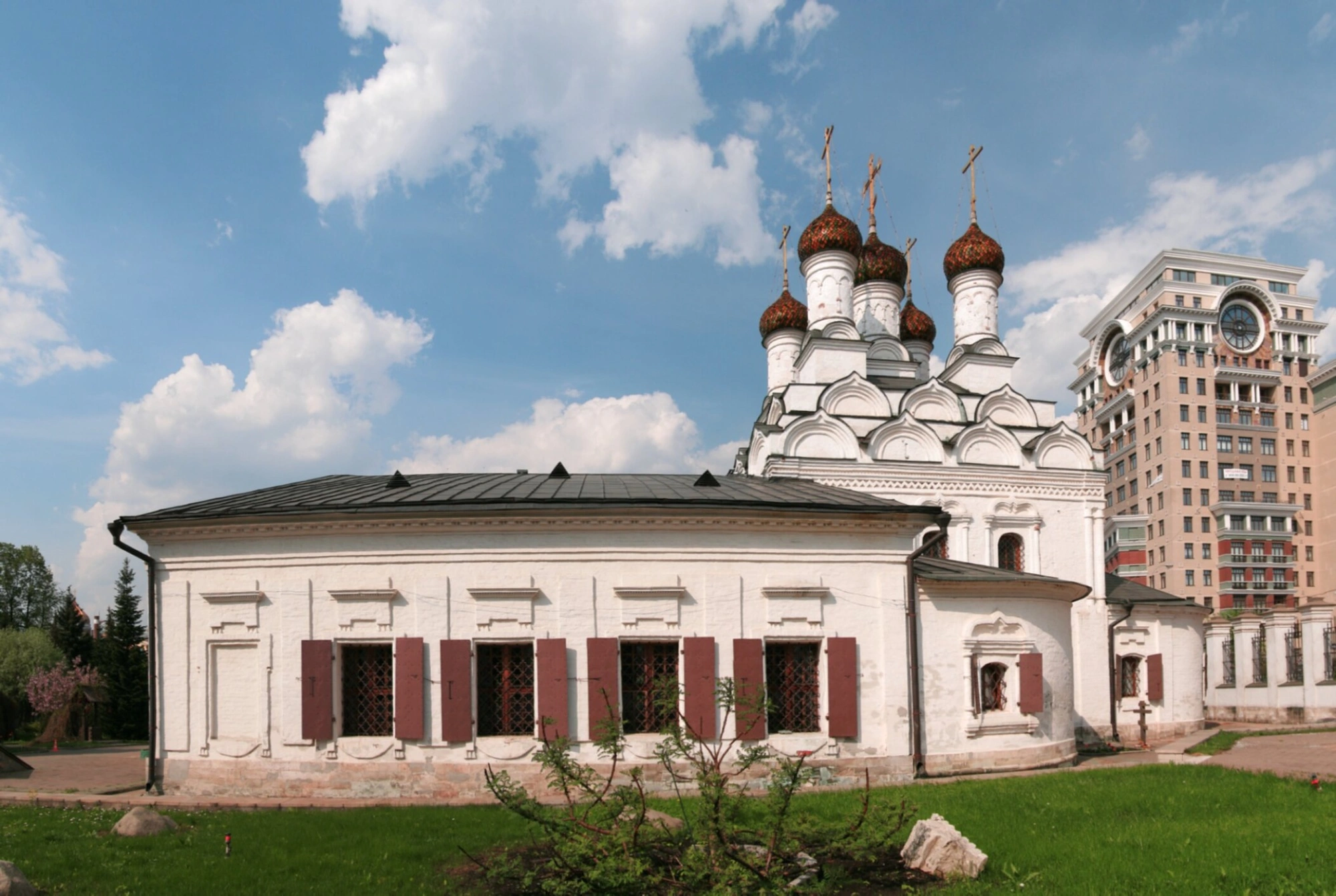 Территория вокруг церкви содержится в образцовом порядке: аккуратно подстриженные газоны и декоративные кустарники обрамляют святыню. На заднем плане просматривается современный жилой комплекс, что символически подчеркивает многовековую историю православной обители, сохраняющей свое духовное значение в динамичной городской среде.