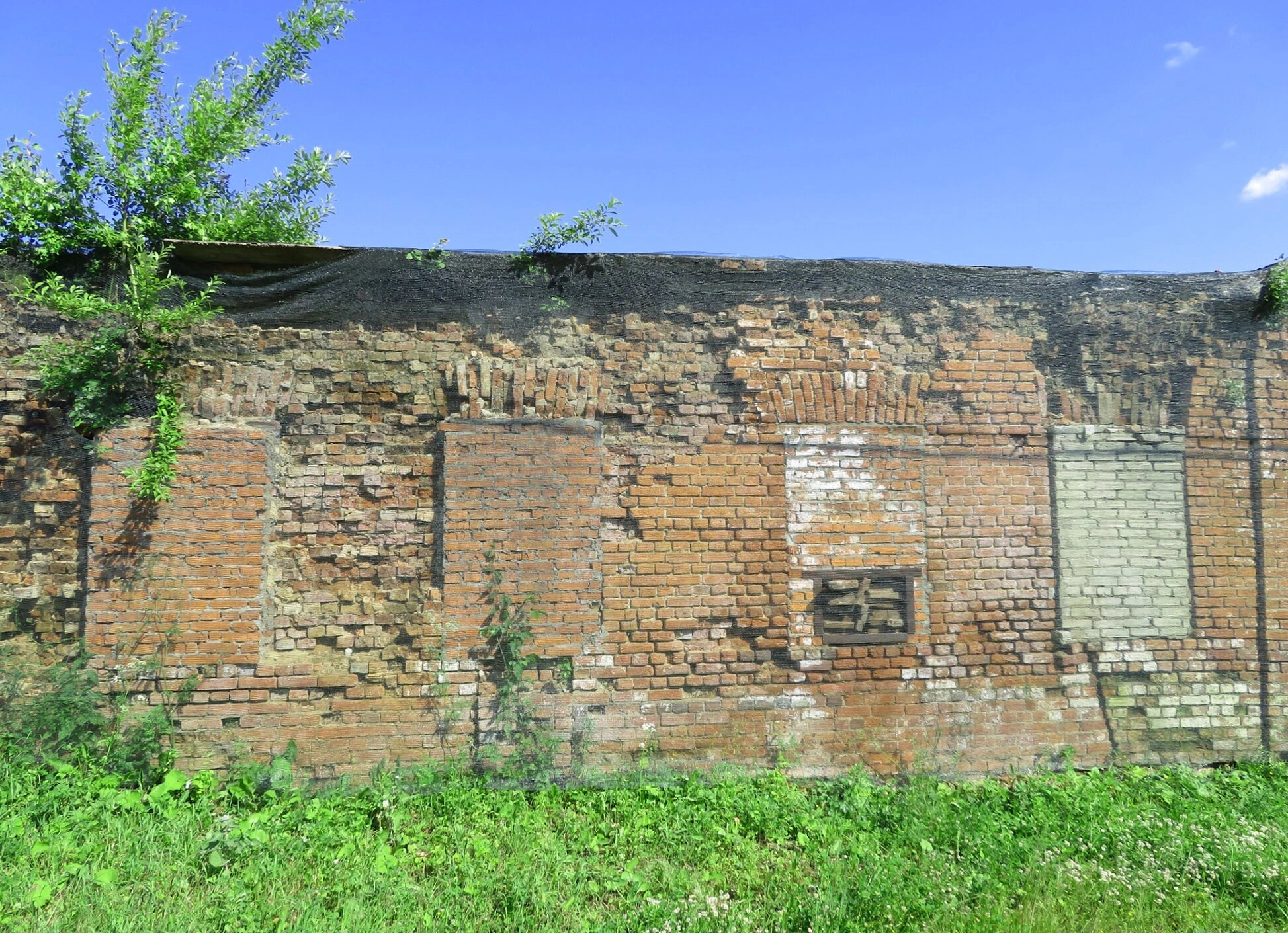 На представленной фотографии запечатлена Церковь Николая Чудотворца в селе Клёново Троицкого района Московской области. Святыня, возведённая в 1793 году в стиле барокко, ныне находится на реставрации, о чём свидетельствует специальное защитное полотно, полностью укрывающее её архитектурный объём. На снимке видны фрагменты кирпичной кладки красного цвета, следы заделанных проёмов, а также растительность у основания и поверх стены. Верхняя часть сооружения покрыта чёрной сеткой, которая обеспечивает сохранность исторического фасада в период восстановительных работ.