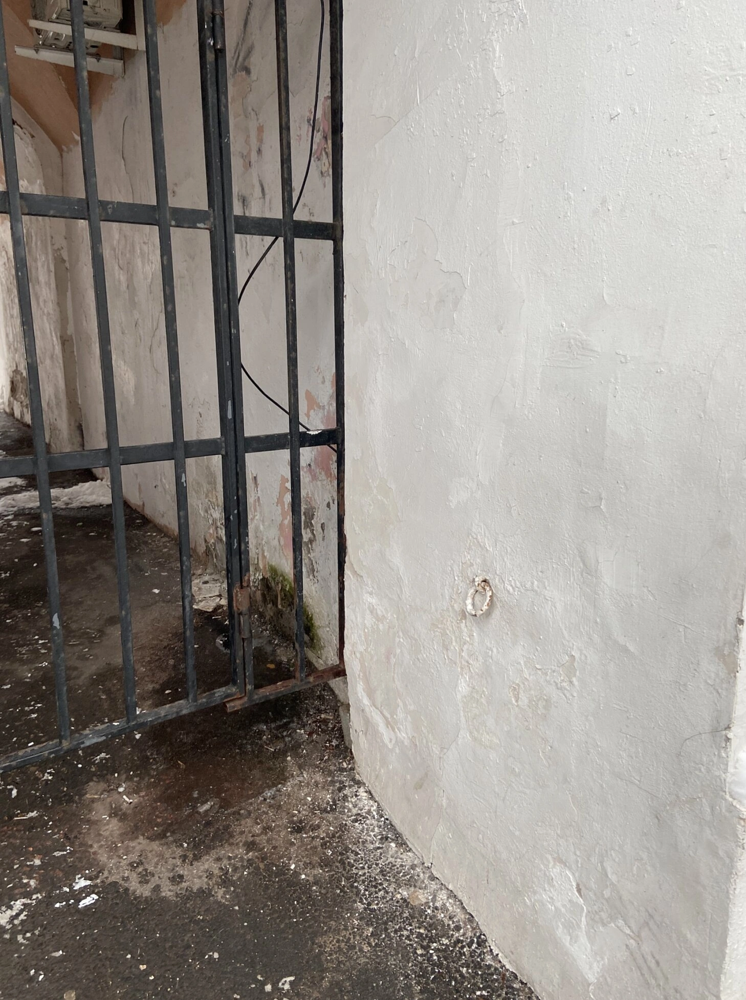 В верхней части композиции видна белая поверхность потолочного перекрытия, сохранившая следы времени в виде характерных трещин. В центре этого перекрытия закреплено металлическое кольцо, вероятно, предназначенное для подвешивания церковных светильников или паникадил. В месте соединения потолка со стеной наблюдается потемнение поверхности, свидетельствующее о возможном проникновении влаги.