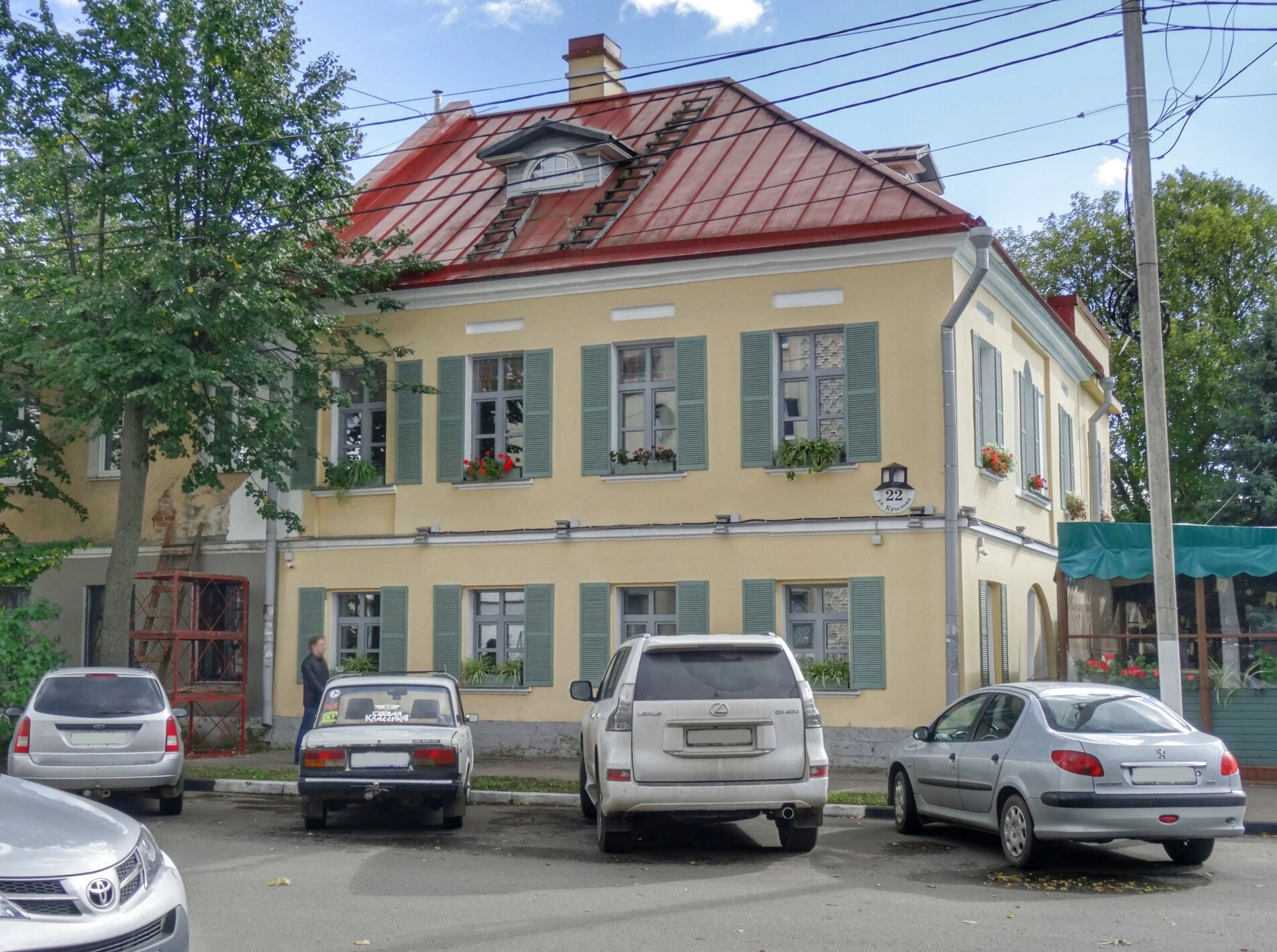 Фасад храма украшен зелёными ставнями, которые установлены на большинстве окон, создавая гармоничный цветовой акцент. На некоторых подоконниках размещены цветочные горшки с растениями, что придает строению ухоженный и жилой вид. Над одним из окон четко просматривается табличка с номером "22", указывающая на точный адрес расположения святого места.