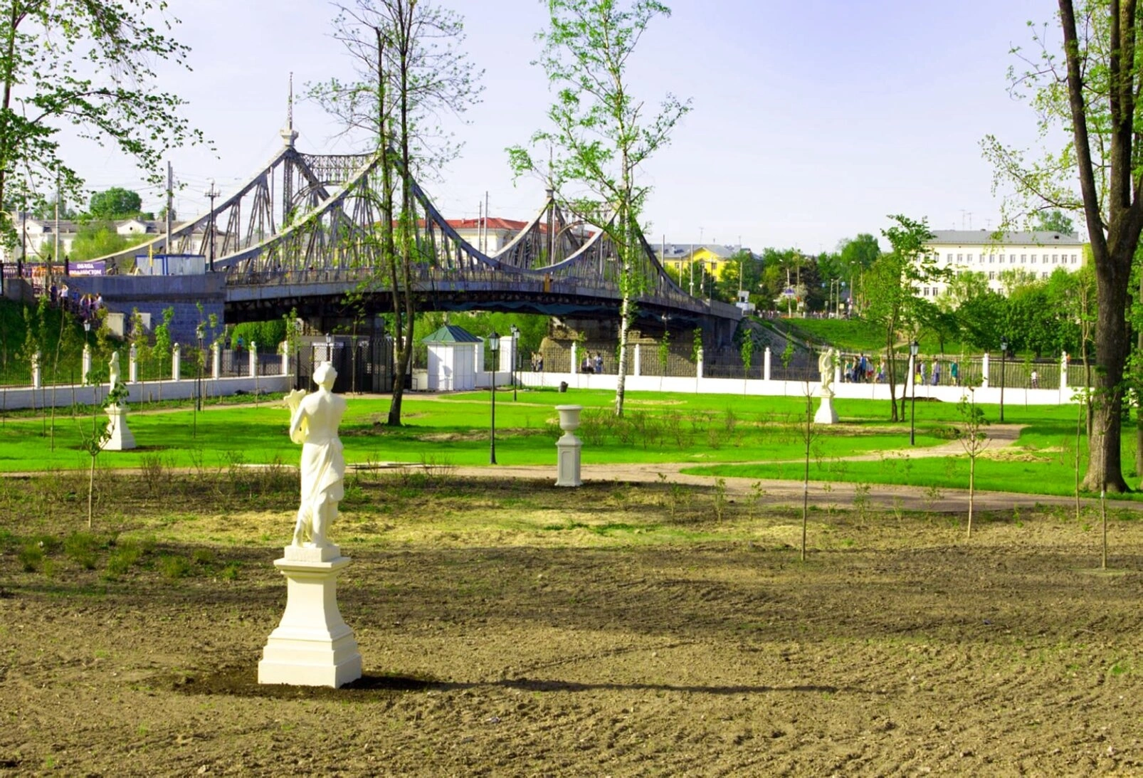 На заднем плане фотографии величественно возвышается ажурная конструкция Староволжского моста через реку Волгу, который гармонично вписывается в городской пейзаж и создаёт единый архитектурный ансамбль с храмом. Мост, построенный в начале XX столетия, является одним из символов Твери и важным элементом панорамы исторического центра города.