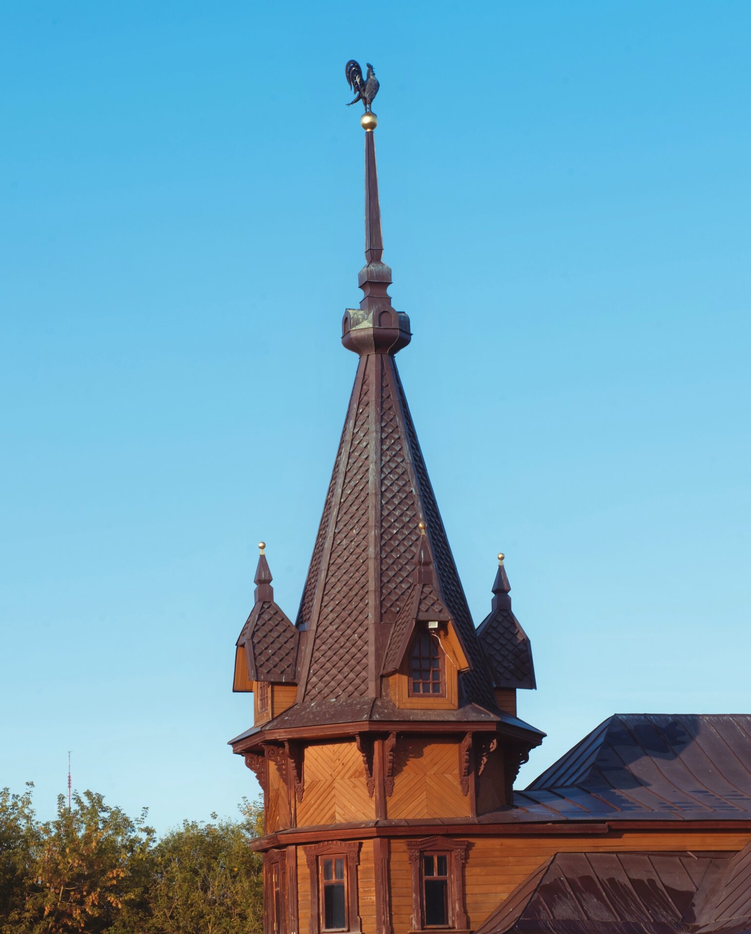 Храмовая архитектура отличается уникальным завершением - высоким шатром, покрытым чешуйчатой кровлей, который венчает изящный шпиль с флюгером в виде петуха. Данный архитектурный элемент имеет глубокое символическое значение в православной традиции, напоминая о отречении апостола Петра и последующем его покаянии.