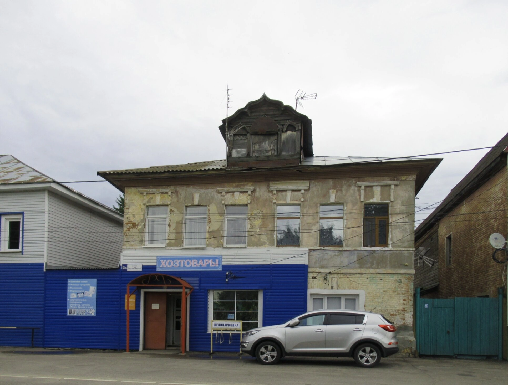 Территория вокруг храма включает прилегающие городские постройки, формирующие исторический облик улицы Советской. На переднем плане фотографии виден припаркованный автомобиль серебристого цвета, что свидетельствует о современном использовании прихрамовой территории.