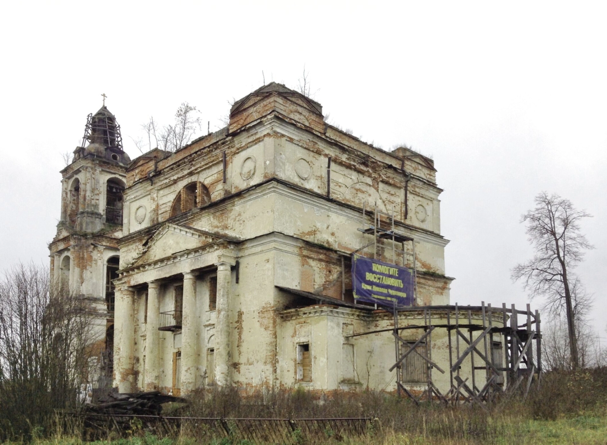 Окружающий пейзаж — заросшая травой территория, сухие кусты и голые деревья на заднем плане — подчёркивает заброшенность места. Пасмурная погода и серое небо добавляют фотографии атмосферу скорби и напоминают о необходимости срочных мер по сохранению этого памятника православной архитектуры.