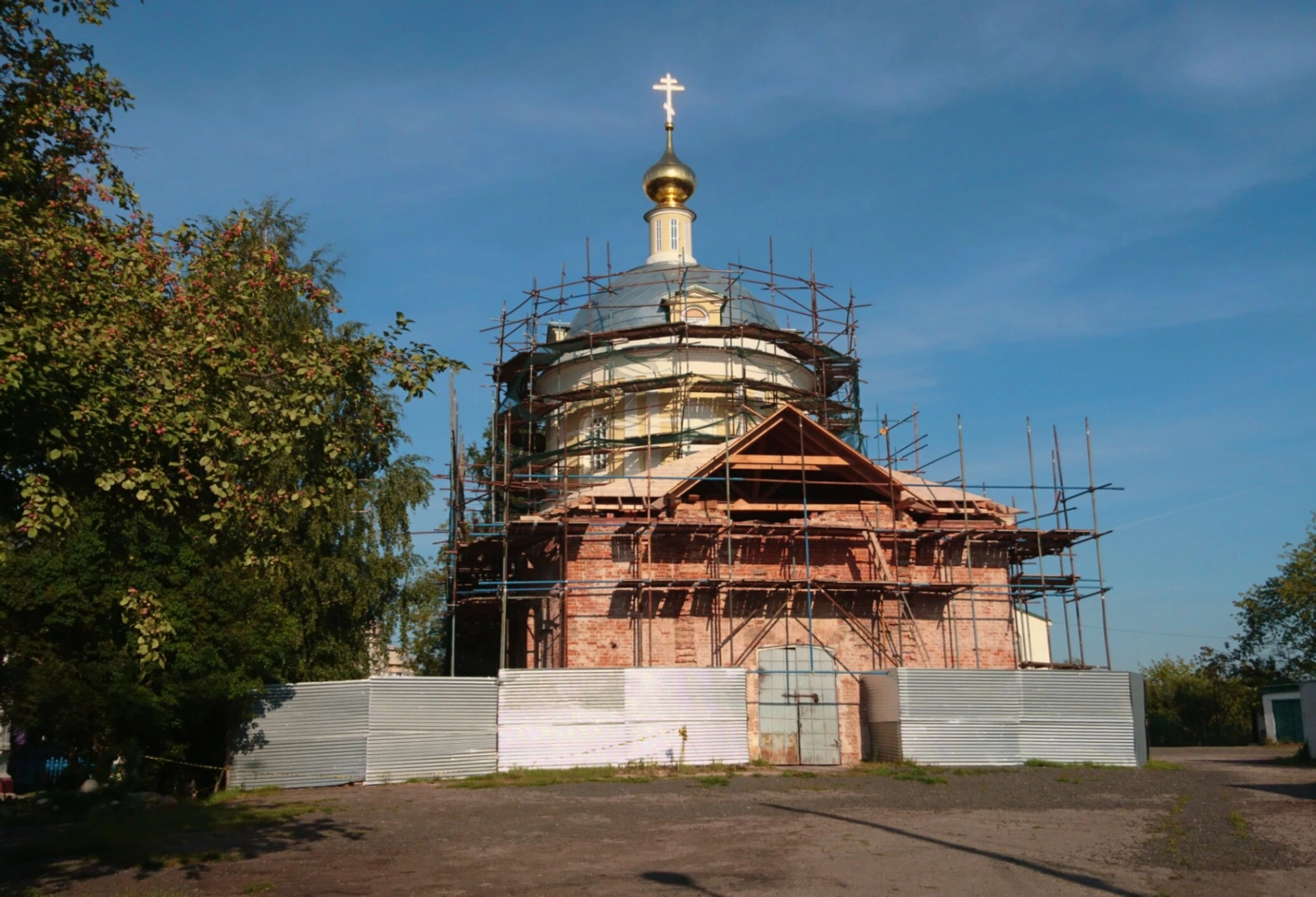 На представленной фотографии запечатлён храм во имя святителя Николая Чудотворца, расположенный в микрорайоне Павшино города Красногорска Московской области. В момент съёмки церковь находилась на этапе масштабных реставрационно-восстановительных работ, о чём красноречиво свидетельствуют установленные по всему периметру здания строительные леса. Эти меры предпринимаются для сохранения уникального архитектурного облика и структурной целостности памятника православного зодчества.