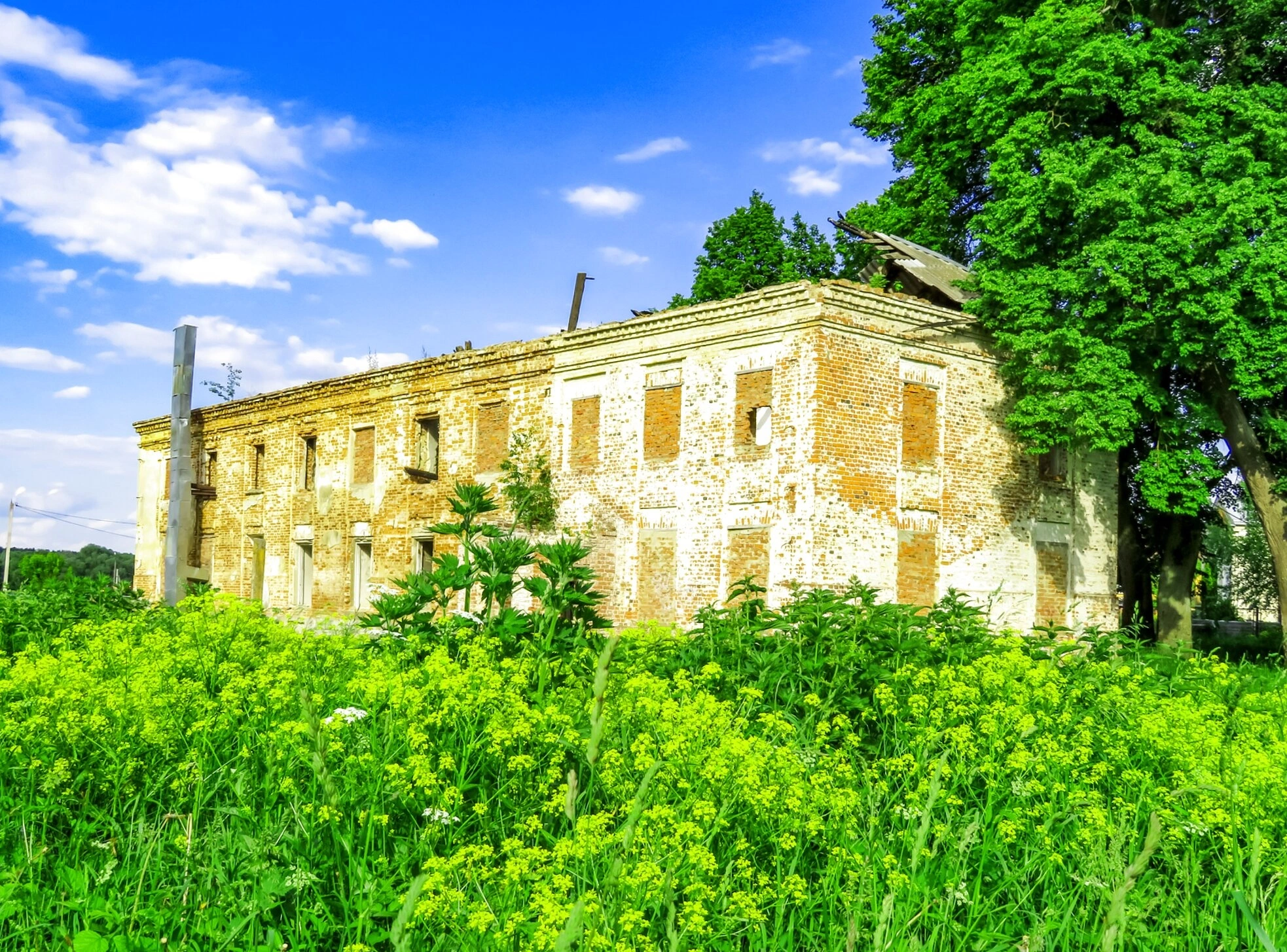 Двухэтажное кирпичное здание храма пребывает в полуразрушенном состоянии, свидетельствуя о годах запустения. Фасад святыни несёт явные следы разрушения: кирпичная кладка местами осыпалась, оконные проёмы частично заколочены досками, а некоторые из них зияют пустотой. Кровля храма значительно повреждена, видны провалы и торчащие деревянные конструкции.