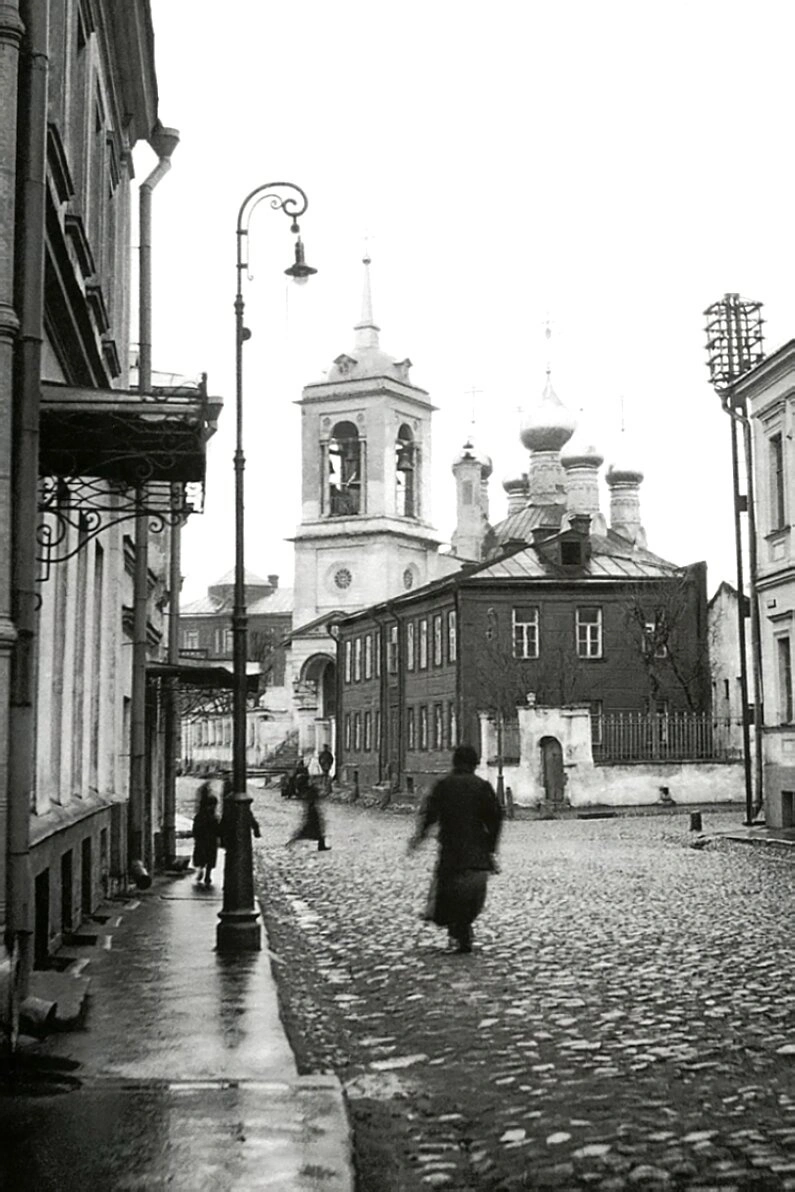 Храм, освящённый во имя одного из самых почитаемых на Руси святых — Николая Угодника, является ярким образцом московского церковного зодчества. На снимке хорошо различимы основные элементы церковного ансамбля: стройная колокольня, увенчанная шпилем, и массивный световой барабан, несущий золочёную главку. Слева на переднем плане виден фасад типичного для того периода городского здания с водосточной трубой и уличным фонарём, что добавляет снимку ощущение подлинности и исторической достоверности.