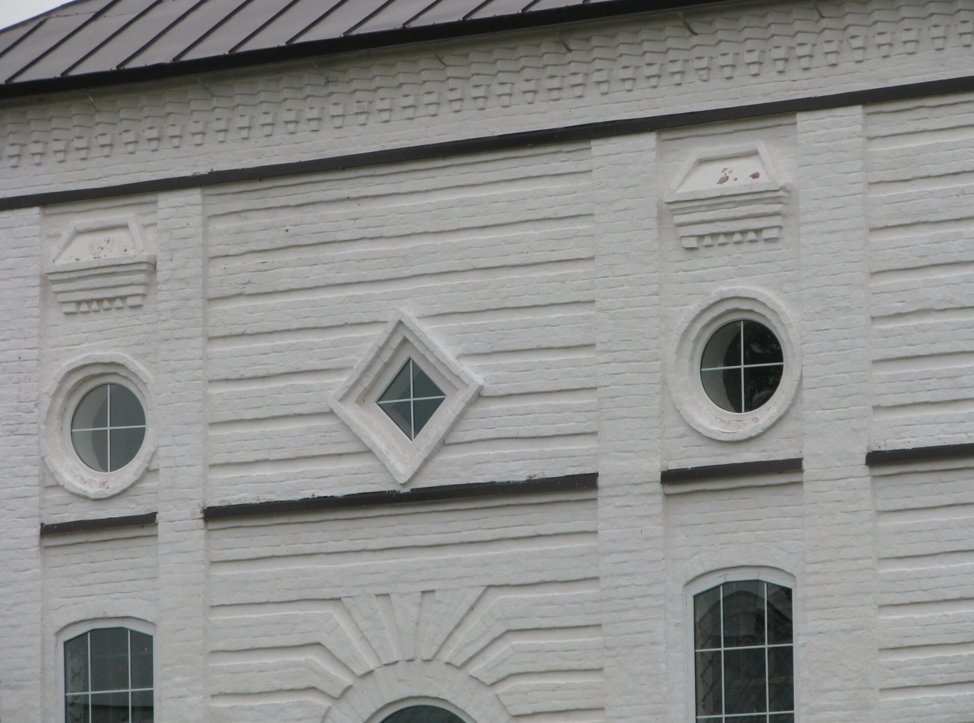 Фасад украшают изящные оконные проёмы, имеющие круглую и ромбовидную форму, с крестообразными переплётами, что является характерным элементом храмовой архитектуры. Над некоторыми окнами размещены декоративные сандрики и наличники, придающие облику здания особую нарядность и торжественность. Верхнюю часть снимка венчает тёмная металлическая кровля, гармонично дополняющаяный образ святыни.