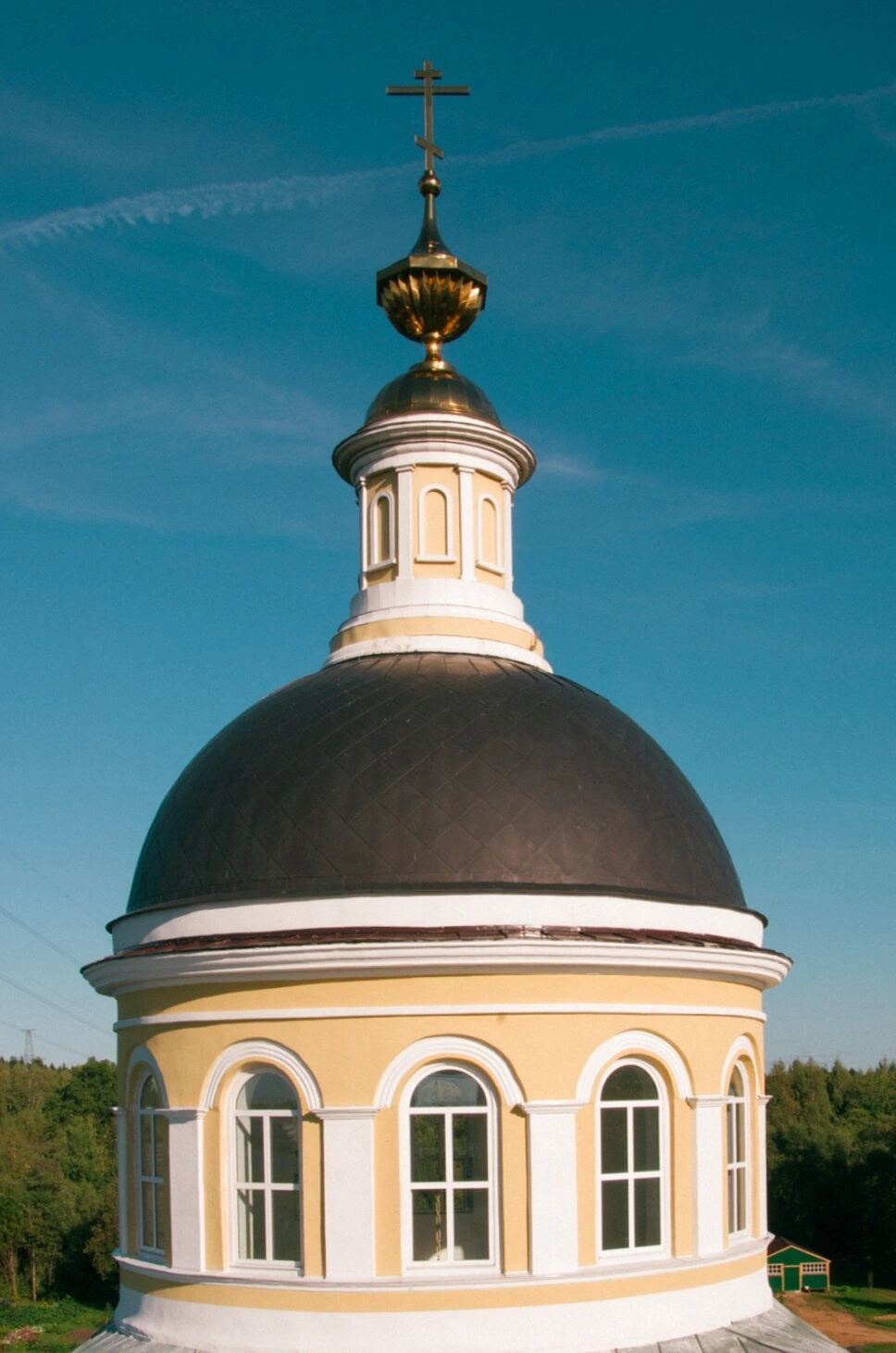 Колокольня, изображенная на снимке, представляет собой трехъярусное сооружение с полуярусом, увенчанное высоким шпилем с православным крестом. Восьмигранный барабан с арочными проемами обеспечивает распространение колокольного звона, который совершался с использованием пяти церковных колоколов. Стены храма, окрашенные в желтый цвет, контрастируют с белокаменными архитектурными деталями, создавая гармоничный облик.