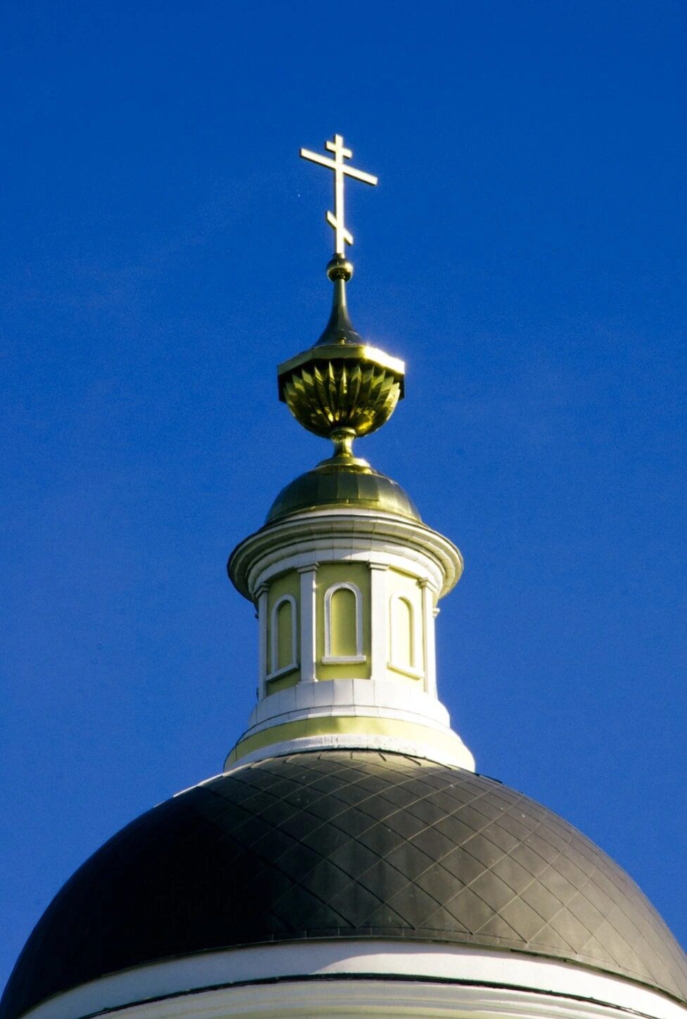 На представленной фотографии запечатлён величественный купол храма во имя святителя Николая Чудотворца, что расположен в селе Белое Московской области. Чёрная маковка церковной главы, выполненная в традиционном для русского православного зодчества стиле, эффектно оттеняет сияние золотого барабана, на котором она установлена. Венчает эту благолепную композицию золочёная главка с водружённым на неё православным восьмиконечным крестом, устремлённым в небесную высь.