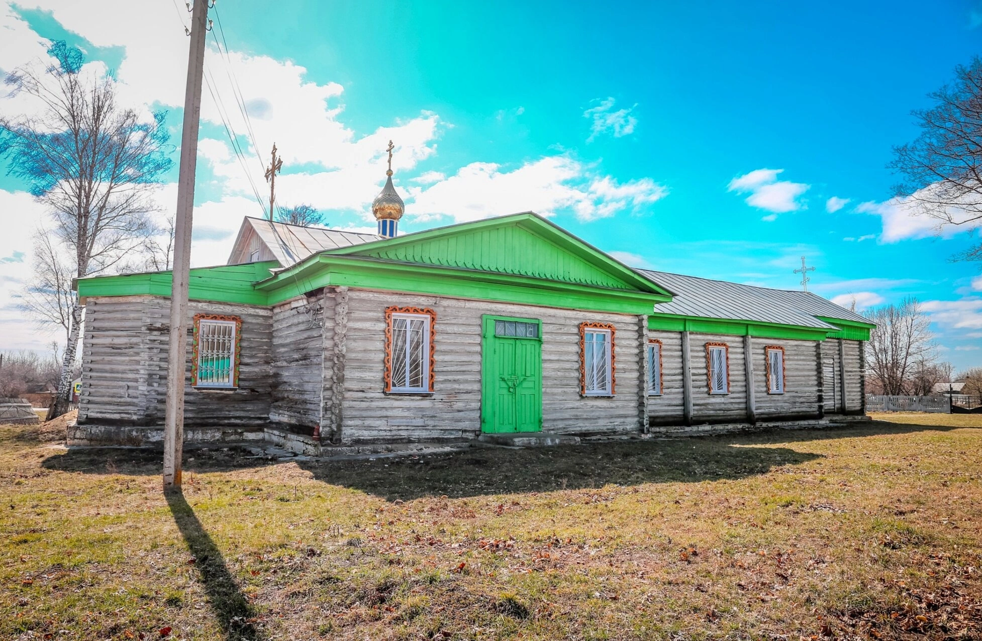 Церковь стоит на открытом участке с пожухлой травой, что указывает на осенний или ранневесенний период. На заднем плане видны голые ветви деревьев и деревянный столб линии электропередачи, говорящие о сельской местности. Никаких людей, рассматриваемых крупным планом, на фотографии не присутствует. Общий вид храма в ландшафте передаёт ощущение тишины, покоя и глубокой связи этого святого места с историей и жизнью окружающего его народа.